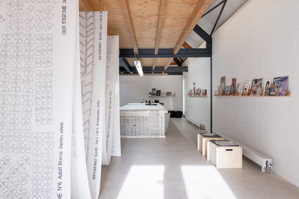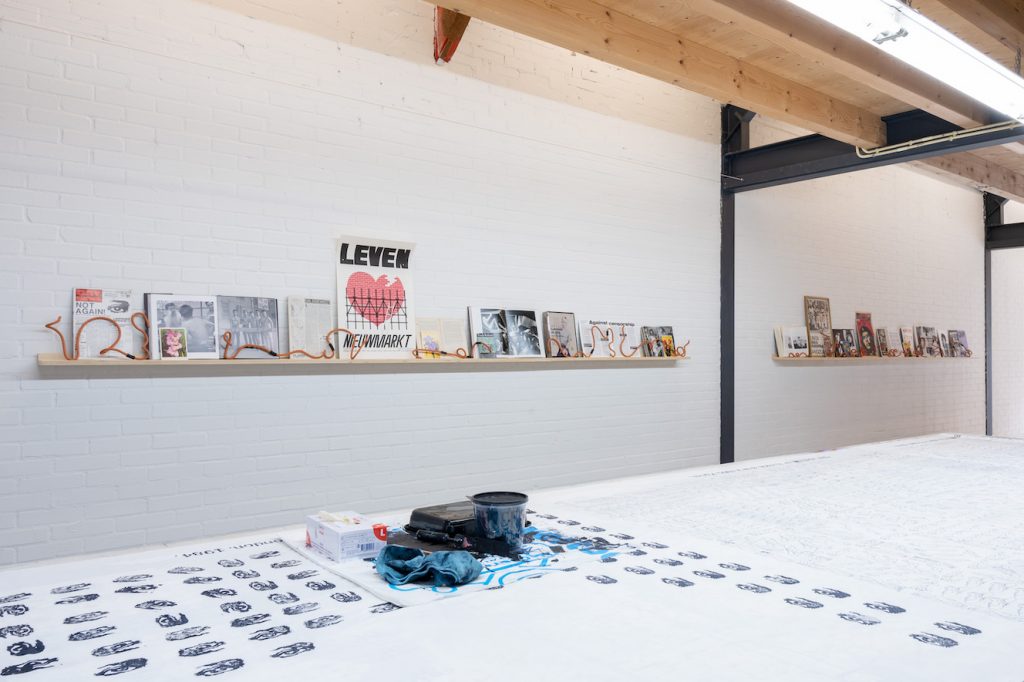 Bijna elke hoek van de tentoonstellingsruimte is door Werker Collective, een kunstenaarscollectief opgericht door Marc Roig Blesa en Rogier Delfos, in gebruik genomen. Voorin de ruimte – Moni en ik konden het al zien toen we door de glazen buitendeur een blik naar binnen wierpen – hangt een groot doek. Het lange stuk textiel lijkt doordat het op sommige punten met touwtjes aan het plafond bevestigd is bijna te zweven, maar op andere plekken raakt de stof ook de stenen vloer. Het doet denken aan een hangmat die tussen twee bomen schommelt of aan kleding die aan de waslijn hangt. Het doek staat vol met motieven en teksten die de kunstenaars van Werker Collective met houtblokstempels hebben aangebracht. Afdrukken van gestileerde kettingen, boekenkasten en woorden vormen samen herhalende patronen.