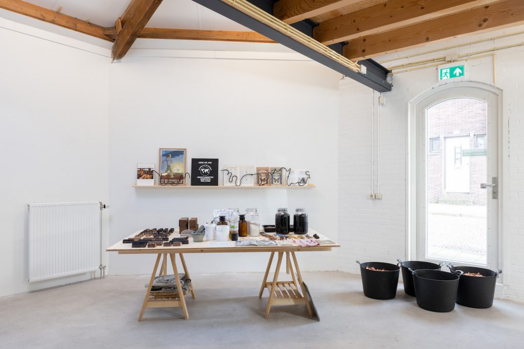 Naast zulke visuele verbanden, lijkt de kunst van het collectief ook in een manier van aanpak in relatie te staan tot het archief. Veel van de documenten die in het archief verzameld zijn worden gekenmerkt door een bottom-up karakter, een eigenschap die Moni terugziet in het stempelwerk van Werker. ‘Het is heel erg DIY’, zegt die. ‘Het moedigt ook aan om zelf iets te maken.’ Dit wordt nog eens onderstreept door de tafel met gereedschap: de kunstenaars delen hun materialen en technieken met het publiek, ze houden niks geheim.
