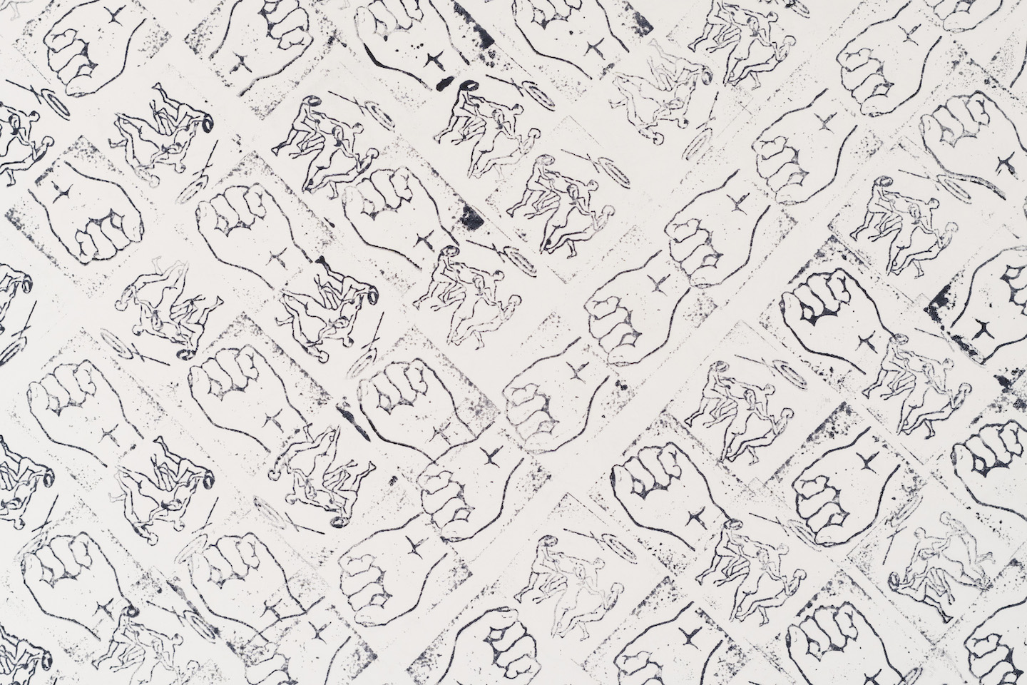 Moni en ik wandelen rond de tafels, bekijken wat van de boekjes en periodieken, en komen uiteindelijk terug bij het grote, hangende doek. Een specifiek patroon dat bestaat uit afwisselende afbeeldingen van een groepje dansende mensen en van een gebalde vuist, spreekt ons aan. ‘Ik vind dit een heel krachtig symbool, omdat het allerlei stromen binnen het activisme verenigd’ zegt Moni, wijzend op de vuist. Vooral de combinatie van de vuist en de dansers valt ons op. Het patroon lijkt uit te drukken dat activisme soms hand in hand kan gaan met iets vieren. Moni kan zich daar in herkennen. ‘We hebben dat bij Trans Zorg Nu vaak besproken. Het is jammer dat het demonstreren nodig is, maar het is ook heel fijn om het met elkaar te doen. Het kan heel krachtig voelen om ergens samen tegenin te gaan.’