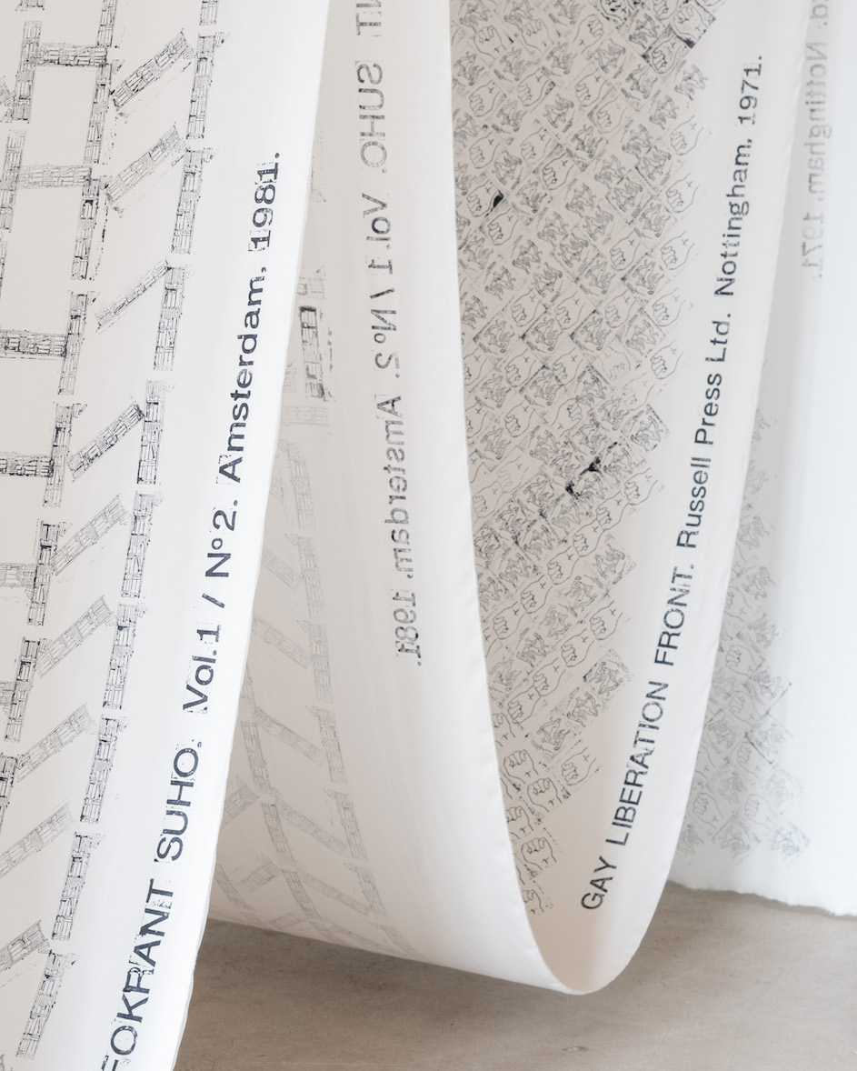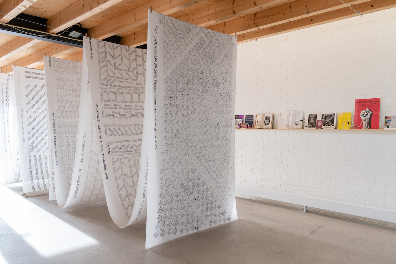 Op een van de boekenplanken aan de wand zien we een Brits manifest over homo-emancipatie uit de jaren 70 met op de omslag hetzelfde groepje dansende mensen. Het plaatje op het zwevende doek is dus, net als veel van de andere motieven die Werker Collective voor hun gestempelde patronen gebruiken, geleend uit het archief. De kunstenaars bouwen in het nieuwe werk voort op een lange geschiedenis van publicaties. ‘Door de beelden uit die oude boeken en bladen te halen, breng je ze weer tot leven’, merkt Moni op.