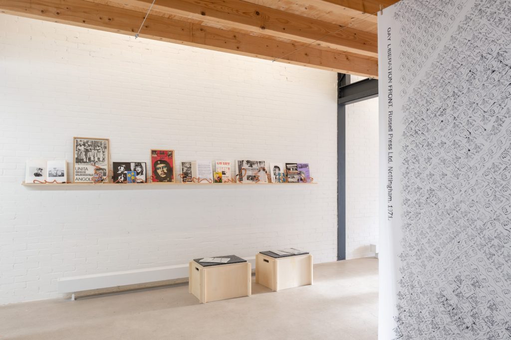 Om deze doeken, dit gereedschap en deze werktafels heen presenteert Werker Collective een deel van hun archief. Aan de wanden van de ruimte zijn houten planken gemonteerd waar allerlei boeken, tijdschriften, zines en posters op leunen. De verzameling documenten, die zich sinds de oprichting van Werker Collective in 2009 steeds verder uitbreidt, omvat diverse thema’s. In Plaatsmaken zien we 20e-eeuwse posters en bladen door en voor queer mensen, maar ook teksten over dekolonialisme, ecofeminisme en woningnood. ‘Verslagheffingen van alternatieve vormen van leven en zijn’, merkt Moni op.