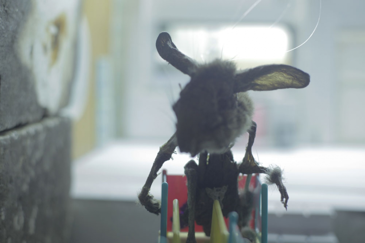 In totaal prepareerde ik 9 konijnen, 4 in mijn eentje, om te oefenen, de andere 5 onder Pierre’s nonchalante toezicht. Ook om te oefenen. Alle geprepareerde konijnen leken na afloop een beetje gehandicapt, maar dat was zo raar nog niet want ze waren dan ook wel eerst half platgereden geweest. Volgens Pierre had ik ‘er best een beetje gevoel voor.’ Ik had hem verteld dat de konijnen als marionetten moesten gaan acteren in een live cinema voorstelling, dus dat ze van dichtbij gefilmd gingen worden in een miniatuur filmsetting, en dat hun pootjes een scharnierpunt moesten hebben om te kunnen bewegen, maar hier is hij nooit op terug gekomen. Het werden uiteindelijk dus nogal stroeve, onwillige acteurs met een onbeholpen motoriek, die zich leken te distantieren van de omstandigheid waarin ze zich bevonden. Om van hun uitdrukkingsloze mimiek nog maar te zwijgen.