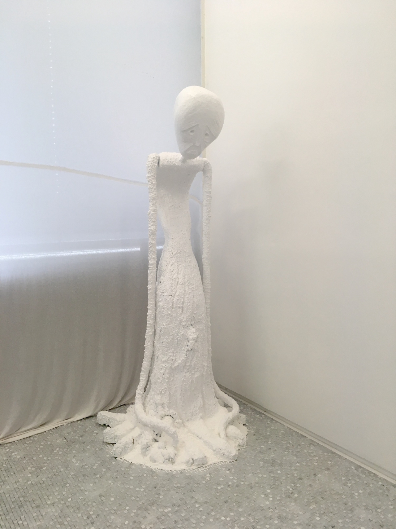 Ik wil in die ruimte met mensen rondlopen, maar ik ben ook blij dat een camera het voor mij doet. Dat ik de ruimte op afstand kan beschouwen, op een witte badkamer vloer met in mijn rug een wit figuur dat zijn kop laat hangen.