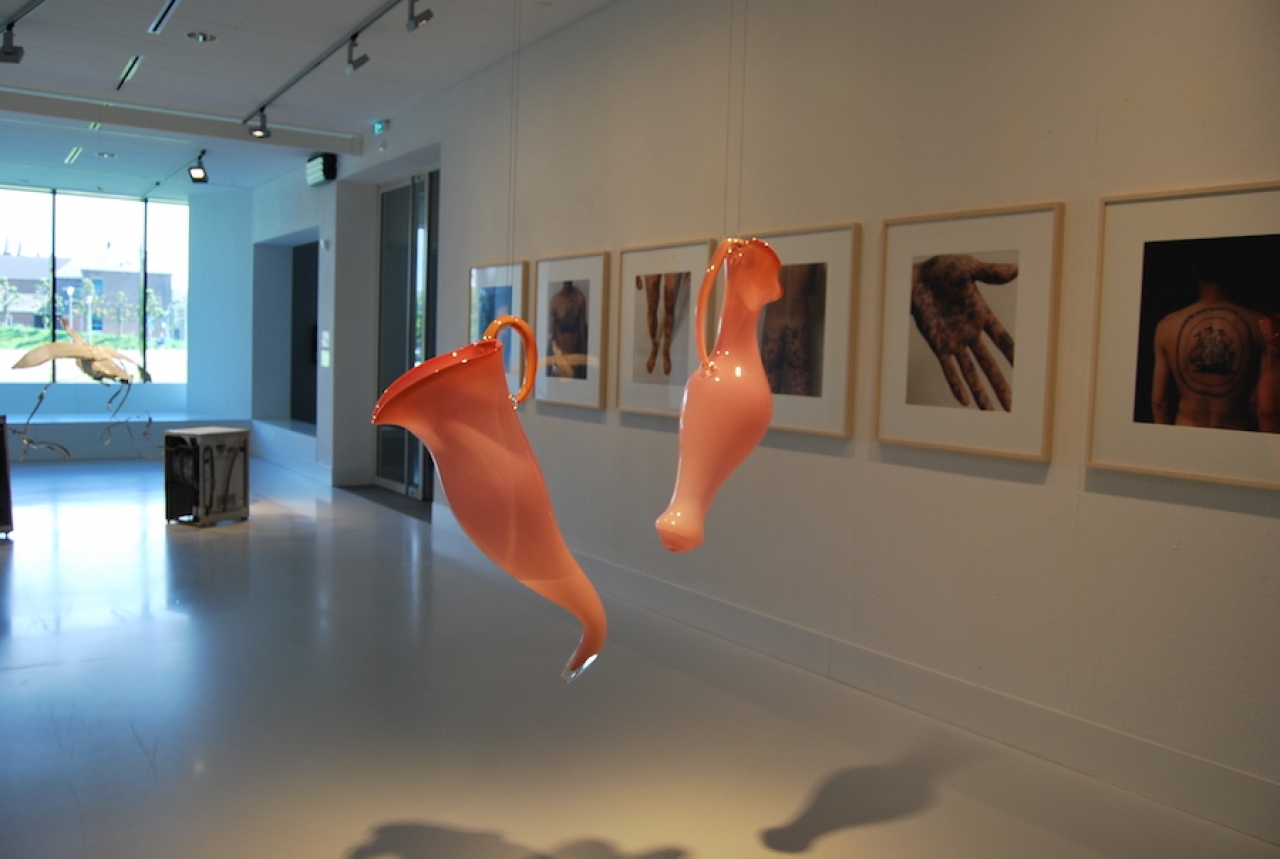 Hangend Kannenpaar (2010) van Maria Roosen speelt ook met de overgang tussen lichaam en object, en toont de kijker twee grillig gewelfde kannen met een antropomorf sausje. Ze zijn dan misschien van glas, maar ze zijn zo rondborstig en glanzend roze dat ze een dimensie van mensellijkheid krijgen, een wulpse persoonlijkheid.
