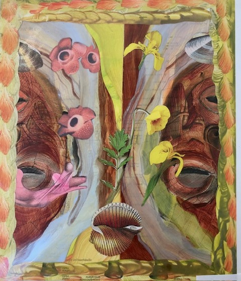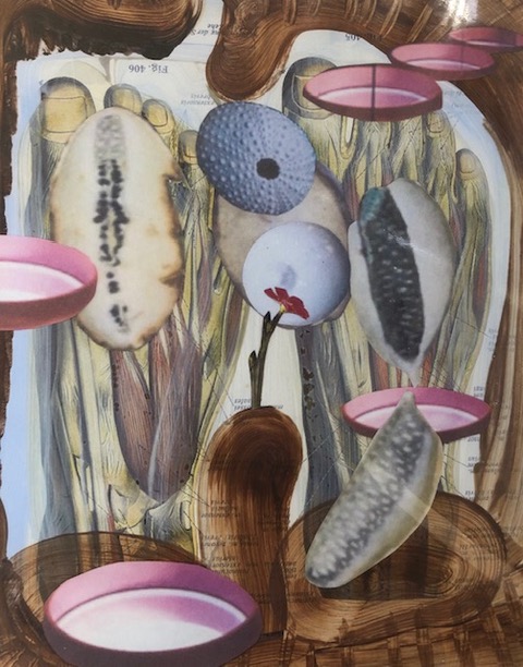 Als ik Aletta Bos in haar atelier opzoek, is ze terug van weggeweest in de voormalige ruimte van Gist. Ze woonde eerder een tijd in Zutphen waar ze ook als kunstdocent actief was, maar na het optrekken van de stofwolken van haar scheiding en de boedelverdeling beheert ze weer de woon- en werkruimtes in Brummen. Achter de tentoonstellingsruimte die ze soms voor presentaties ter beschikking stelt aan andere kunstenaars, ligt haar atelier. Dat is gevuld met een overdadige hoeveelheid werk, vooral collage- en schilderwerken waarin ze landschappelijke achtergronden combineert met uitgeknipte foto’s van planten en bloemen. Opvallend zijn ook de talloze stukken kleurrijk porselein met een organisch en botanisch karakter, als in de natuur gevonden fossielen. Alleen al door de omvang van alles wat ze maakt, is duidelijk dat de noodzaak van haar kunstenaarschap onvermijdelijk is.