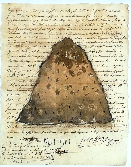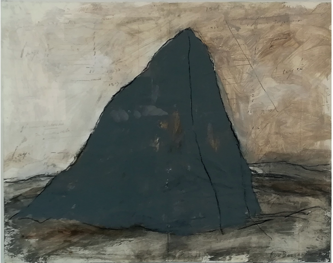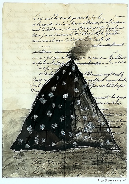 “Het probleem voor mij in Nederland was: te weinig natuur en te veel mensen. Dat benauwde me, maar het had ook met onzekerheid te maken. Eenmaal met Thea in Frankrijk begon ik daar bouwprojecten te begeleiden, vooral in uitvoerende zin met vaak Britten als opdrachtgever. Mijn kunstpraktijk stond op een laag pitje. Ik was druk met die projecten, mijn eigen huis en mijn gezin met Thea en de kinderen. Toen ik die ‘manoir’ in Mesterrieux had gekocht en op al dat historische materiaal stuitte, niet alleen officiële documenten maar ook handgeschreven liefdesbrieven en berichten van soldaten aan het front, kranten en kleding, veroorzaakte dat bij mij beeldende impulsen. Ik ging weer meer tekenen en schilderen en er ontstond samenhangend werk over waar ik was en de geschiedenis van een plek in het landschap, de voortdurende opbouw en vernietiging van menselijke inspanningen in verhouding tot de omgeving en de natuur.”