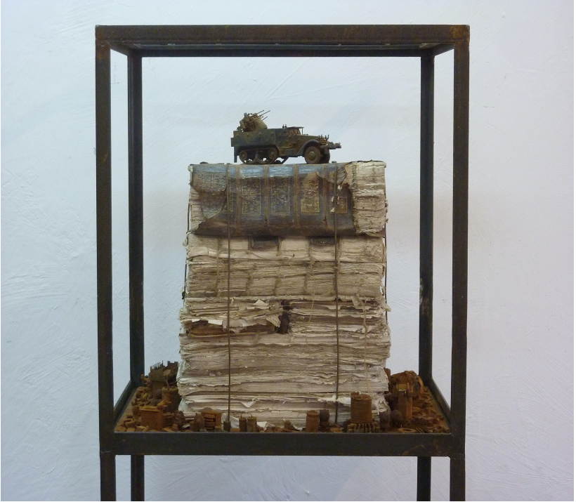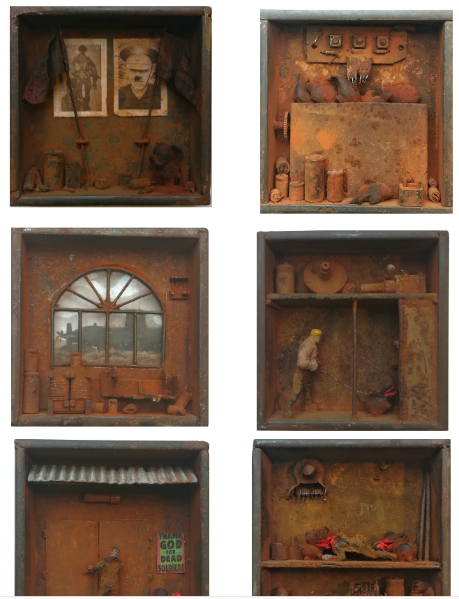 Als tegenhanger van die tastbare werkelijkheid die verdwijnt, maakt hij ook een groeiende serie werk onder de titel ‘La monde obscure en miniature’, ondiepe diorama’s van tien bij tien centimeter waarin hij zowel daadwerkelijke als fictieve strijdtonelen ensceneert. Daarin combineert hij feitelijke artefacten met bewerkte figuurtjes uit speelgoedwinkels ontleend aan de merchandise van eigentijdse scifi-verhalen en de vergelijkbare, vaak romantiserende vernietigingssymboliek uit de cinematografie. Het hele idee van ‘oorlogje spelen’ krijgt bij hem in deze roestrode tableautjes een ijzerhoudende bloedsmaak in een persoonlijk spijkerschrift dat van alle tijden is.