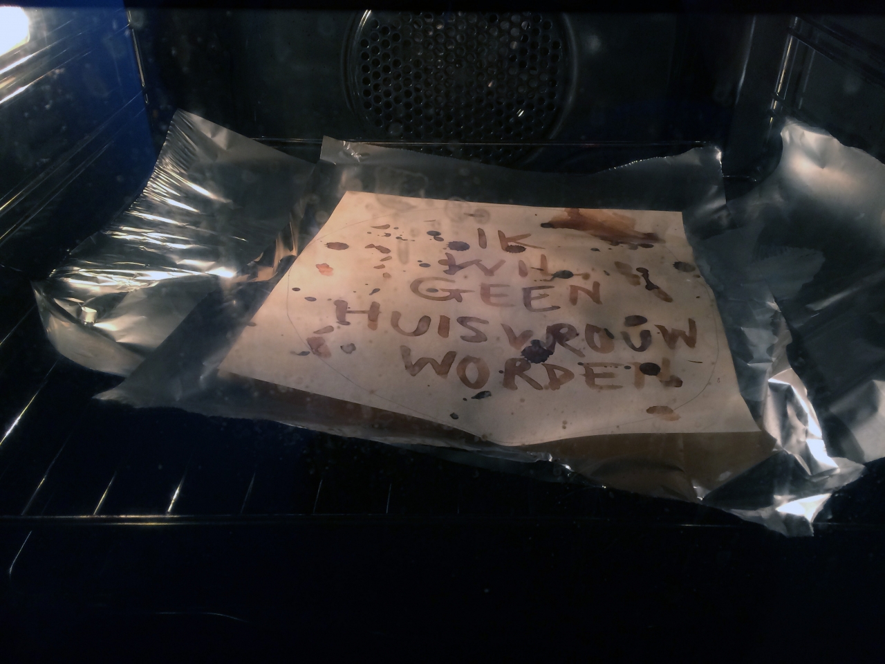 Materiaal: gekolfde moedermelk op papier. Koemelk zou ook gekund hebben. Met melk kun je onzichtbaar tekenen en schrijven. Als je de tekst of tekening vervolgens strijkt of in de oven stopt (170 graden), wordt de tekst zichtbaar.