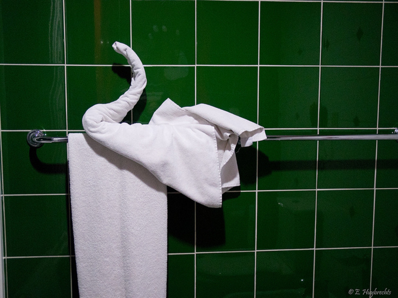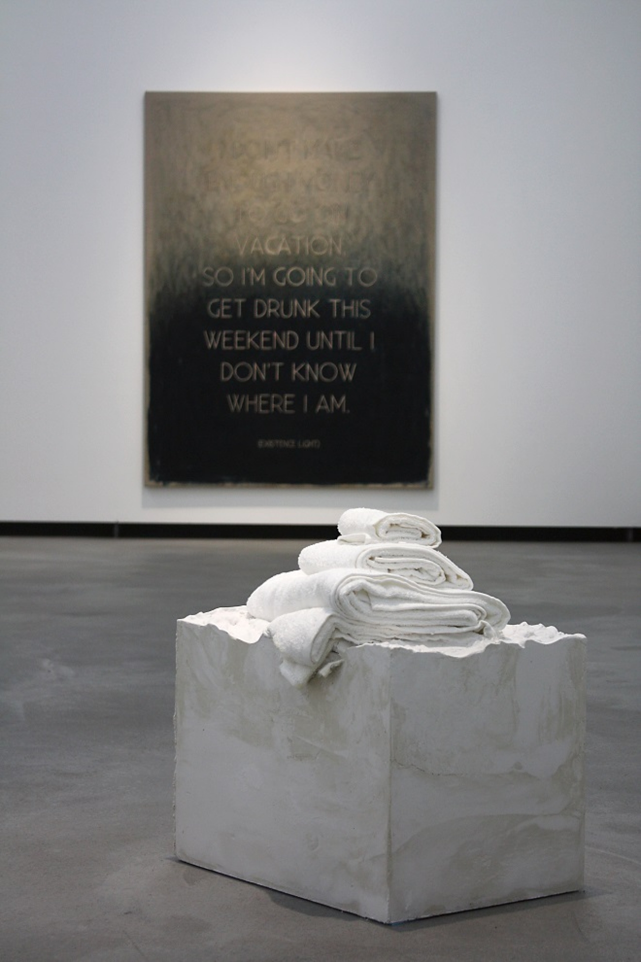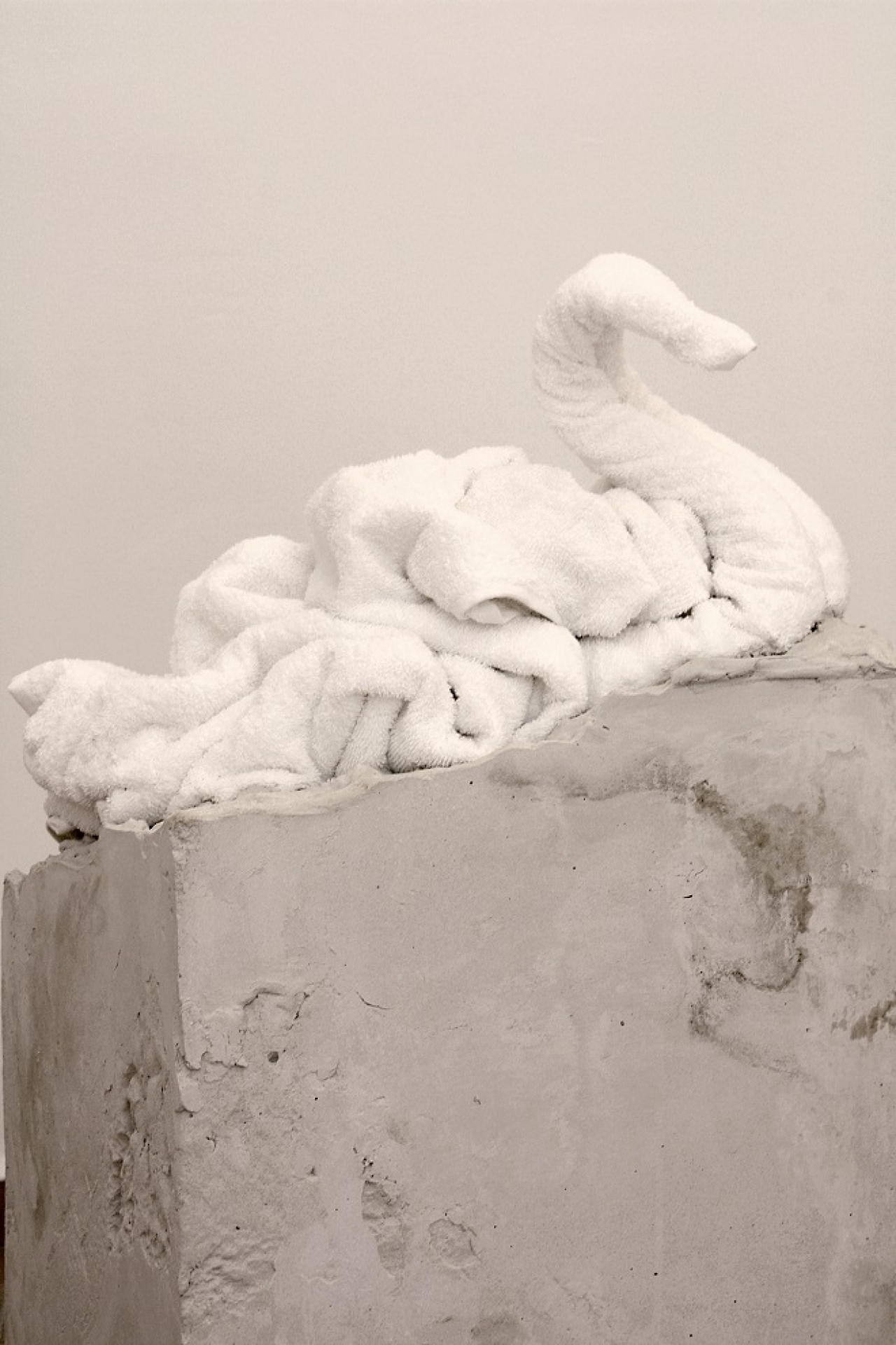 Een paar jaar geleden begon ik met het schilderen van gevouwen handdoeken, het soort die klaar liggen op bedden in hotels. Ik vind dit interessant, het is als een symbool voor luxe, want wanneer je zelf je handdoek vouwt in de vorm van een zwaan is dit echt totale tijd verspilling, een nederig gebaar, waar niemand aandacht aan besteed, maar wat teder is. Wanneer een – vaak onderbetaalde – schoonmaakster dit voor je doet, kunnen we zoiets maar weinig waarderen. De sculpturen gemaakt door schoonmaakpersoneel, combineer ik in sommige van mijn beelden met gips, een materiaal dat meer traditioneel gebruikt wordt in de kunst. En een ander perspectief van waarde en luxe wordt hierbij toegevoegd wanneer ik, als kunstenaar, mij deze beelden toe-eigen. Mijn sculpturen van origami gevouwen handdoeken in de vorm van een zwaan hebben geen direct verband met mijn eigen onderkomens. Ik ben al een lange tijd geïnteresseerd in dit soort beelden als een symbool van “het goede leven”, het geluk en succes waar men graag mee wil pronken bij andere mensen.