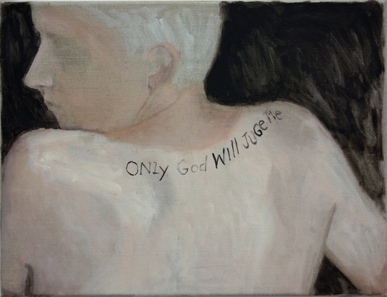 Een ander voorbeeld is een rug met tatoeage die ik schilderde, met de tekst “Only God will juge me”, een van de vele ”tattoo fails” die ik op internet tegenkwam. Deze tatoeage bestaat echt, maar ik heb de afbeelding wel een beetje bewerkt voor het schilderij. Dit was zeker de beste mislukte tatoeage die ik tegenkwam op Google, omdat het zegt dat alleen God hem zal beoordelen, terwijl tegelijkertijd het hele internet hem uitkotst vanwege deze spelfout. Dit werk, evenals veel andere werken beïnvloed door de ”tan fails” die op internet rond circuleren, zowel de spelfout als de zonnebruining gone wrong, geven natuurlijk een link terug naar het klasse perspectief.