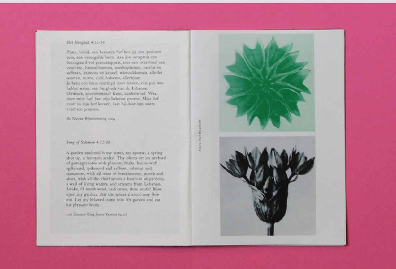 Bij de deuren naar de zaal ontvangt elke toeschouwer een klein boekje. In het begin was er niks. Woorden in zwarte inkt vullen de zwartmatte voorpagina van het kleine boekje. De woordenreeks start met niks, helemaal niks, de kleur blauw wordt als het eerste ‘iets’ genoemd. Het proces wat daarop volgt probeert de woordenstroom in losse woorden te beschrijven, wat eigenlijk niet te beschrijven valt: het ontstaan van de wereld. In de dansvoorstelling 3: The Garden van Nicole Beutler wordt de woordenstroom uit het boekje uitgesproken door een Belgische performer. Motley bespreekt de dans in boekvorm.