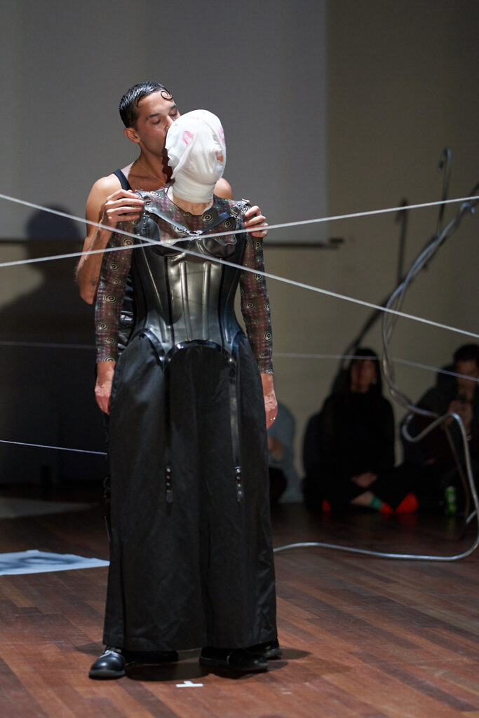 Het uitrollen en bespelen van de draden creëerde een web dat visueel resoneerde met Lydia’s videoperformance Cage (1978), waarin zij als jonge vrouw in een witte overall binnen een stalen kooi haar lichaam markeerde met gekleurde potloden. Voor een kort moment bestond haar eerdere performance naast haar live aanwezigheid. Door te trekken en te componeren met de draden was het alsof tijd tastbaar werd in de ruimte, terwijl het web een fysieke grens vormde die door de kunstenaars werd opgerekt.
