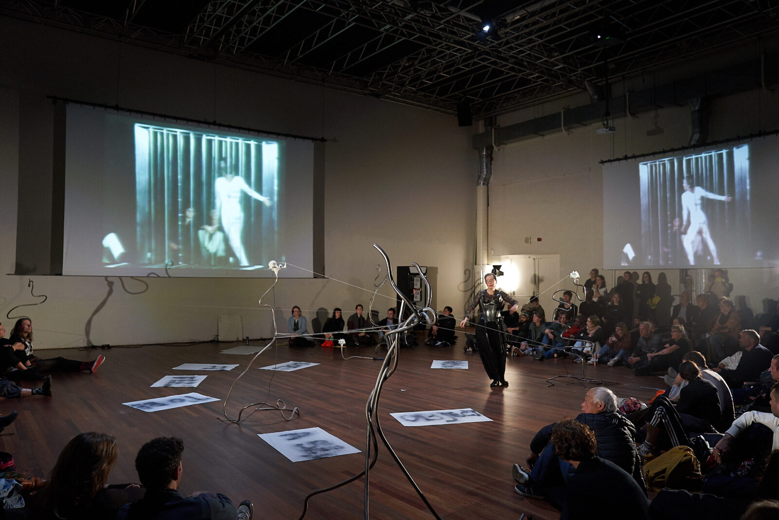 Rondom het grote podium werden vroege en recente videowerken van de kunstenaars geprojecteerd, beginnend met Lydia’s Echoes of Death / Forever Young: een werk uit 1986, gemaakt in opdracht van en uitgezonden op de Nederlandse televisie, over het ideaal van eeuwige jeugd en hoe televisie het verval van schoonheid vaak onzichtbaar laat. De video bestaat uit een ritmische stroom van beelden, begeleid door korte tekstzinnen, waarin een reclameachtige ideaallichaam verschuift naar iets dierlijks en uiteindelijk naar een vorm die zich aan menselijke tijd en identiteit onttrekt. Lydia zei eerder over dit werk: ‘De belangrijkste taak van de media lijkt het vernietigen van chronologische tijd te zijn (…) door film- en geluidsopnames uit het verleden te presenteren alsof ze deel uitmaken van het heden. Ze worden allemaal onderdeel van een bevroren tijd’.