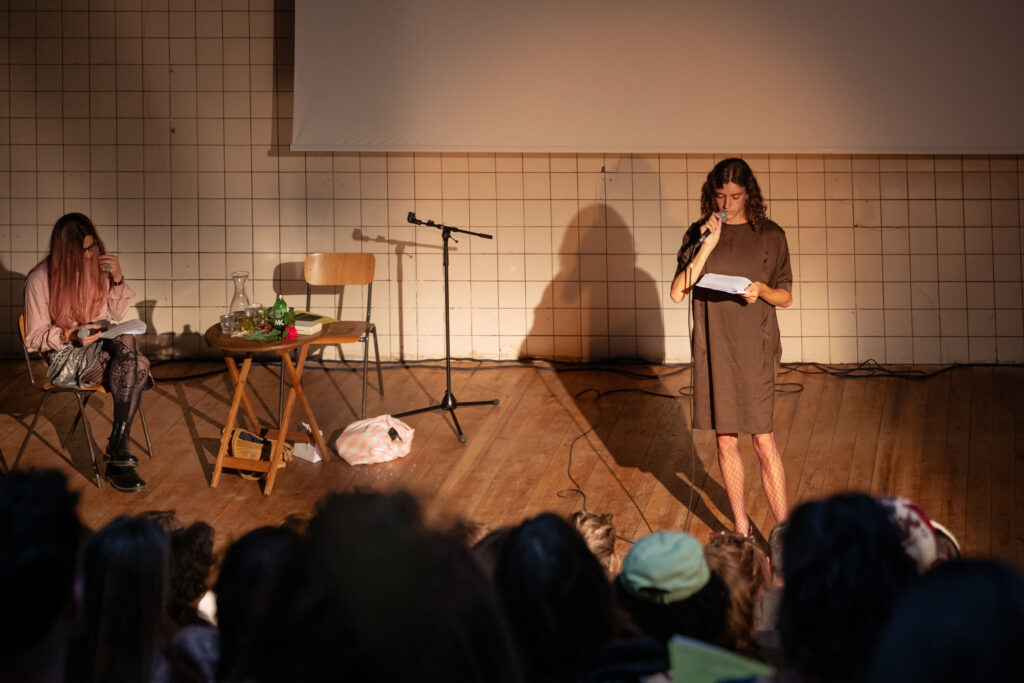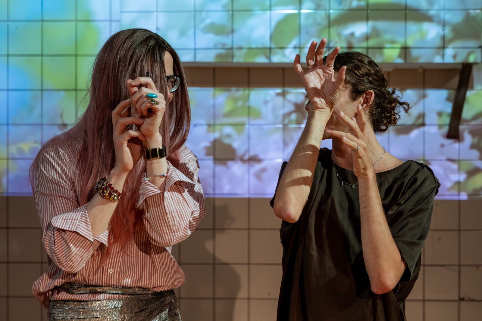 Fragmenten van feministische kunstenaars die latere generaties queer en trans kunstenaars beïnvloedden, werden getoond naast werk van Sands en Billy. Zo was er Schneemanns alternatieve kunstenaarsportret Imaging Her Erotics (1993), waarin zij haar artistieke visie in beeld brengt. Ook Wilkes Gestures (1974) werd getoond, waarin zij met subtiele of expressieve hand- en gelaatsbewegingen strak de camera inkijkt, terwijl Billy synchroon de bewegingen volgde en Sands live commentaar gaf. Later die avond droegen de kunstenaars elkaars teksten voor en belichaamden ze elkaars woorden. Billy nam Sands bij de hand om samen te bewegen. Zo ontstond een dynamische uitwisseling vanuit Sands’ visie dat ‘educatie mogelijk is in alle richtingen en in alle stadia van het leven’.