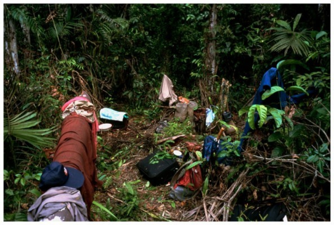 Zie hier het thema van People in the Woods, de presentatie van werk van Roy Villevoye in Motive Gallery. Wie de jungle betreedt torst meer dan zijn leven met zich mee, niet in de laatste plaats het leven van de generaties voor hem. De dingen die hij daar vindt hebben zijn voorgangers er achtergelaten. De schone, onbeschreven lei die de jungle belooft te zijn, bestaat niet. Van wat de reiziger met zich meedraagt kan hij niet anders dan ook een deel achterlaten. Hij zal de mensen die hij tegenkomt onherroepelijk raken, ze veranderen, zoals hij ook zelf niet kan terugkeren als degene die hij was.