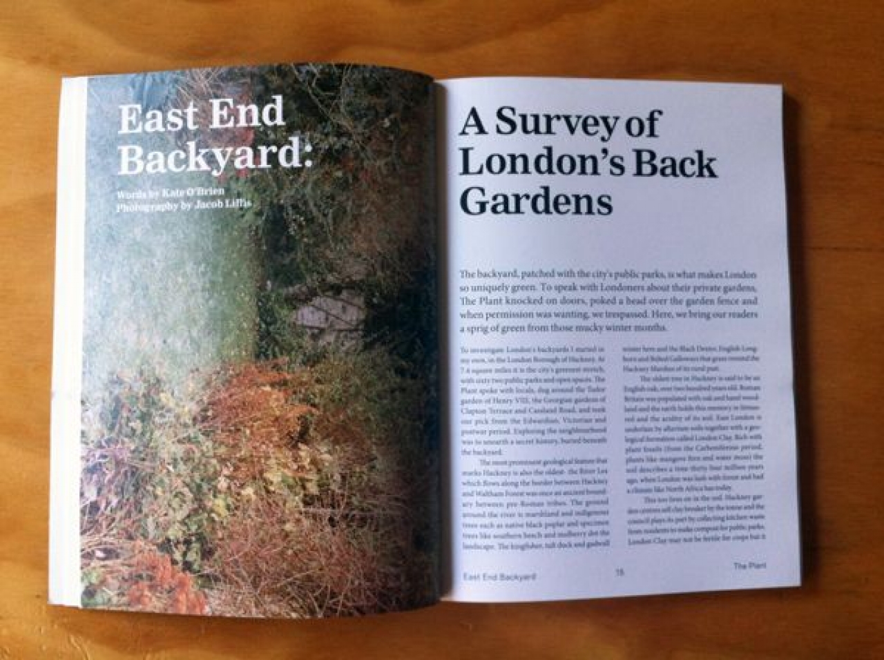 Het eerste artikel in het magazine is een uitgebreide special over de weelderige achtertuinen in Londen. De stad met de rode dubbeldek-bussen, Tate Modern, het chaotische en overvolle metro systeem, Brick Lane met al zijn Indiase restaurants en de brede Themes, heeft een verborgen geheim. Uit het artikel, geschreven door Kate O’Brien, blijkt het nog niet gemakkelijk is om door te dringen tot de privé tuinen van de rijke Londenaren, maar uiteindelijk krijgt ze enkele eigenaren te spreken die ze uitgebreid interviewt over hun verborgen schat. De meeste tuinen in Nederland zijn aangeharkt, betegeld of soms zieltogend verlaten, maar eigenlijk lijkt geen van hen op hun Londens broers en zussen. Deze zijn wild, woekerend, groener dan groen en vooral: minimaal geregisseerd en vooral overgelaten aan de vrije groei van het gewas. De foto’s zijn genomen door Jacob Lillis: ietwat overbelichte opnames die zo uit een oude polaroid camera zouden kunnen zijn gekomen.