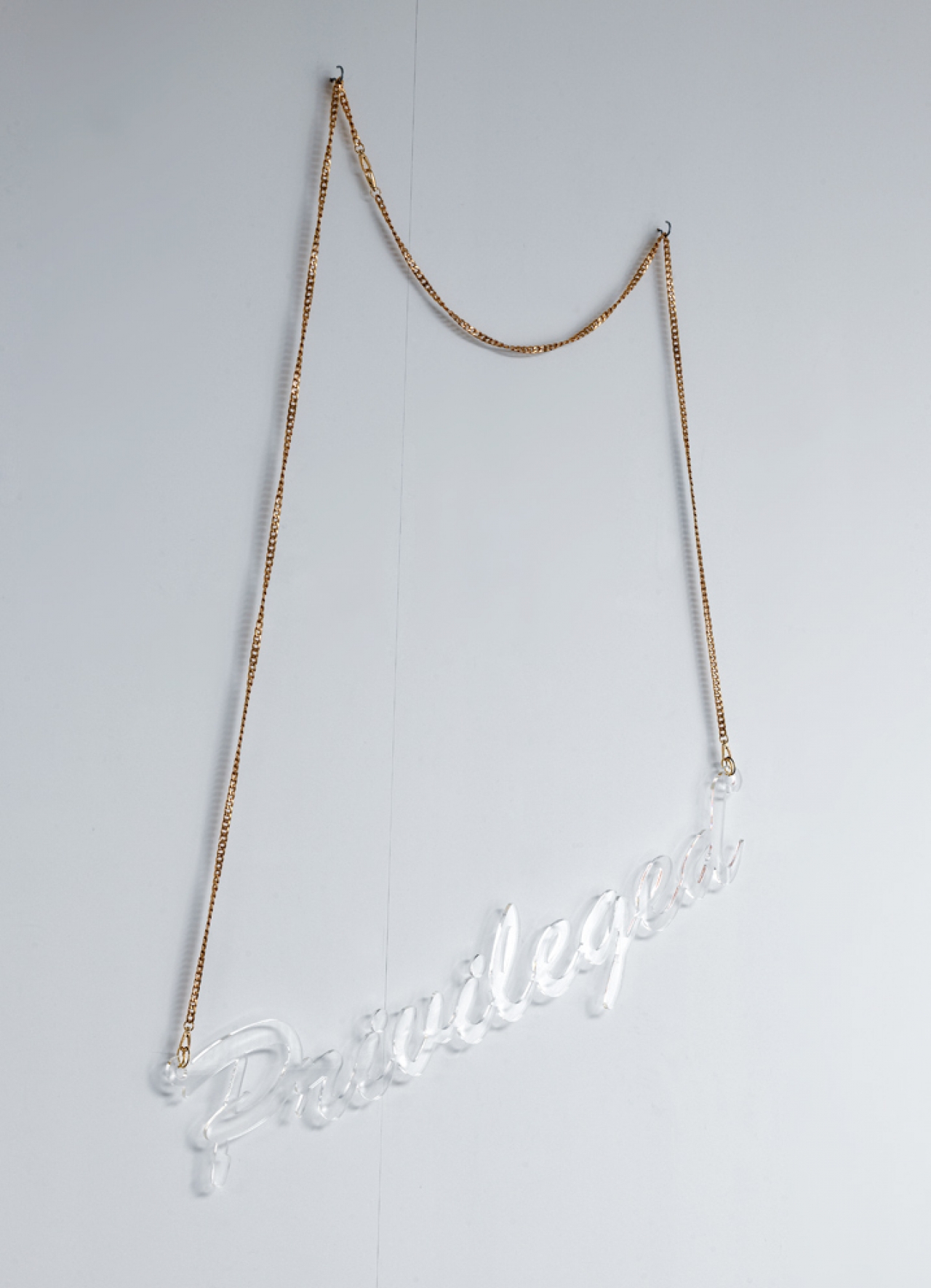 Je naam in gouden, gekrulde letters om je nek is het subtiele accessoire die veelal als ordinair wordt gekarakteriseerd. In de tentoonstelling zijn deze kettingen buitenproportioneel opgeblazen en schitteren op verschillende plekken in de ruimte. Het zijn geen namen, maar woorden als Entitled, Priviliged, Blessed en Lucky, die de lege stempels vormen waar meisjes en vrouwen mee worden betiteld. Het fijne, genuanceerde kettinkje wordt een zware boei die vrouwen vastketent door de blik van de maatschappij.