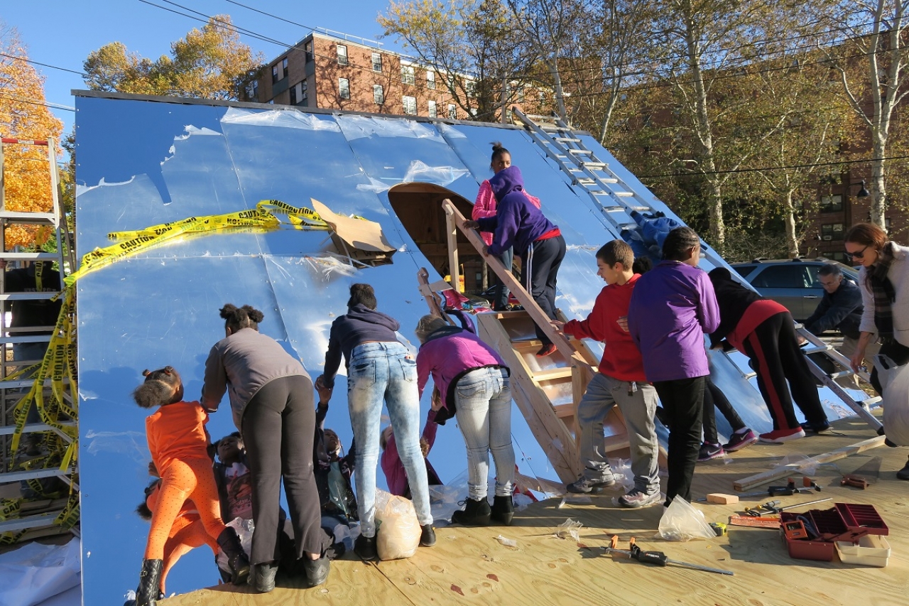 Welcome Stranger (Main Street) is a site-specific sculpture in the public space, situated on the field of grass opposite the Bohlmann Towers Housing Projects in Peekskill. It is a wooden structure with a stage, as well as billboard and a mirror with an passageway and a covered space. The structure broadly refers to two events in the African American history of Peekskill: the Underground Railroad, which assisted refugees from southern slavery in the mid-18th century, and the Peekskill Riots, which erupted after a 1949 open-air concert by Paul Robeson, an African American musician and civil rights activist, and were tinged with anti-Communist and racist overtones. The nature of these two moments in history was very different, but they do share common themes, such as racism, tolerance and welcoming ‘the other’ in the community. These are issues that relevant always and everywhere, even now in the modern-day Europe that the two artists come from. The billboard with the cylindrical passageway and the sheltered space refer to the Underground Railroad and to the Safe Houses. The opening in the mirror, in which the sky is reflected, is a reference to public space that is open to everyone, while the open stage refers to Paul Robeson and the Peekskill Riots.