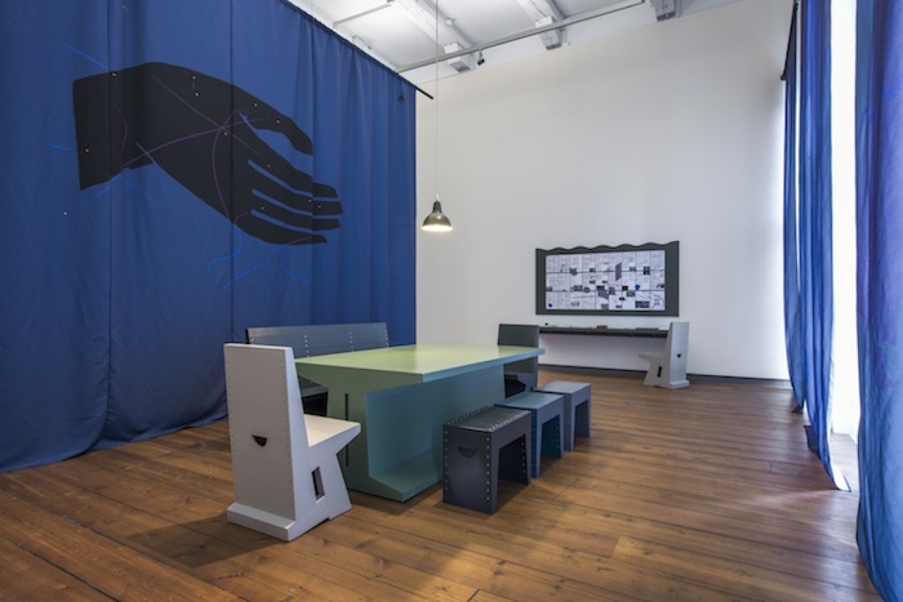 In de ruimte waar Foundland haar werk presenteert valt meteen een grote bak met pingpongballen op. Honderden witte balletjes waarop coördinaten, landkaarten, en slogans zijn geschreven in de kleuren rood, zwart, groen en blauw. Later, wanneer ik de kunstenaars spreek, blijkt het getekende handschrift met een ingewikkelde printrobot te zijn vervaardigd.