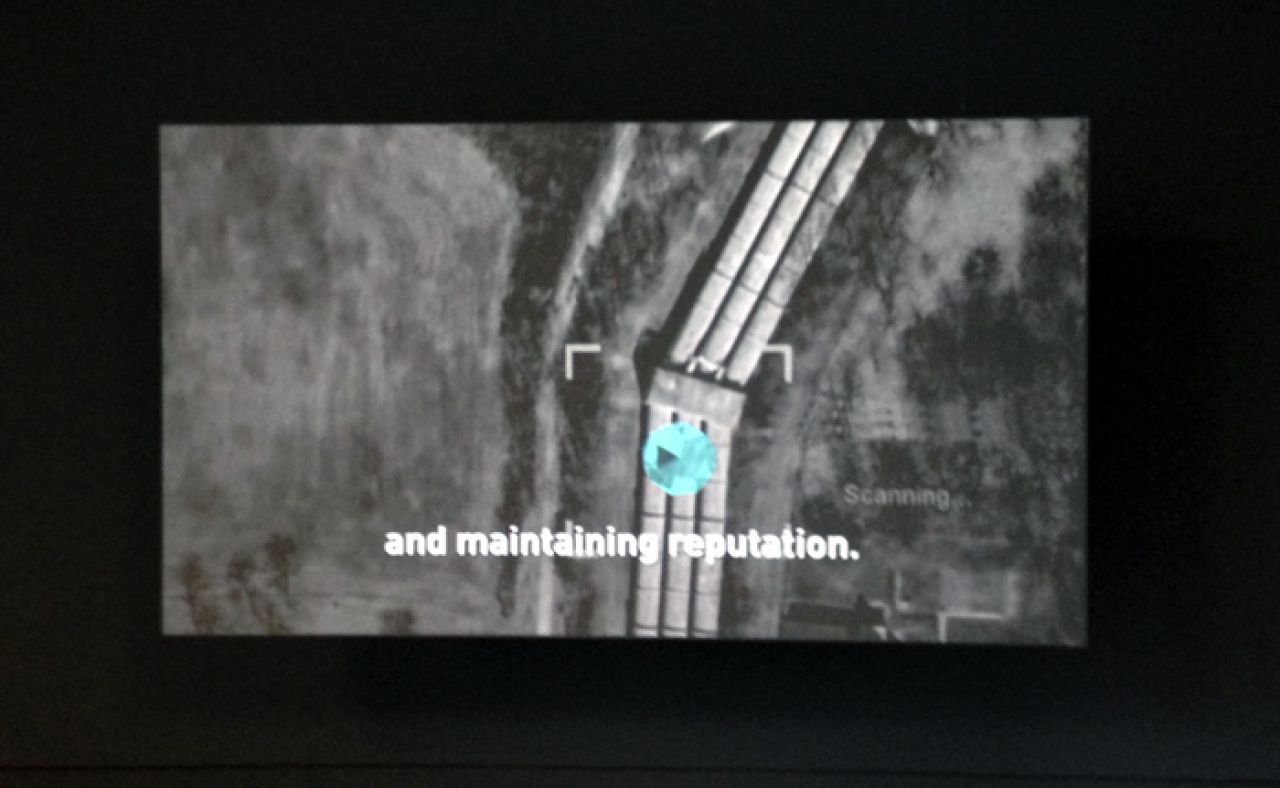 Aan de rechterkant van de ruimte hangt een groot scherm waaruit je een stem hoort praten. De vader van Ghalia; Yassin -die ook recentelijk uit Syrië is gevlucht naar Cairo- probeert al pratend vat te krijgen op de gebeurtenissen in zijn land. De toekomst van zijn land is zo onzeker en onduidelijk dat de man zich vasthoudt aan narratieve verhalen afkomstig van de radio en de tv om überhaupt een beetje grip te krijgen op de problematiek. Zijn generatie heeft de overgang meegemaakt van de Pan-Arabische toekomstdroom van de Egyptische president Nasser, naar de dictatuur onder de Assad familie, tot de recente horror van de IS. Op het scherm zie je Yassin niet, maar iets dat op een zwart/wit oorlogsvideogame lijkt. De beeldtaal heeft ook een directe link met de sneeuwachtige ruisbeelden die het nieuws soms bereiken van luchtaanvallen, maar in plaats van een rode laser zien we bij het werk van Foundland een gekleurde diamant op het doel richten.