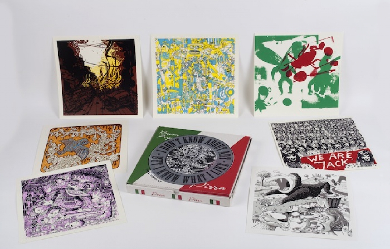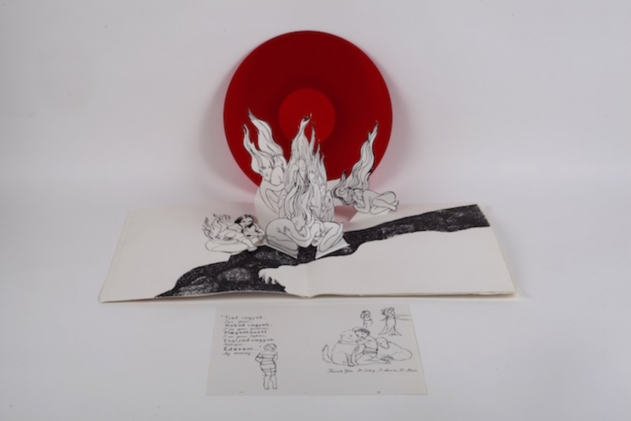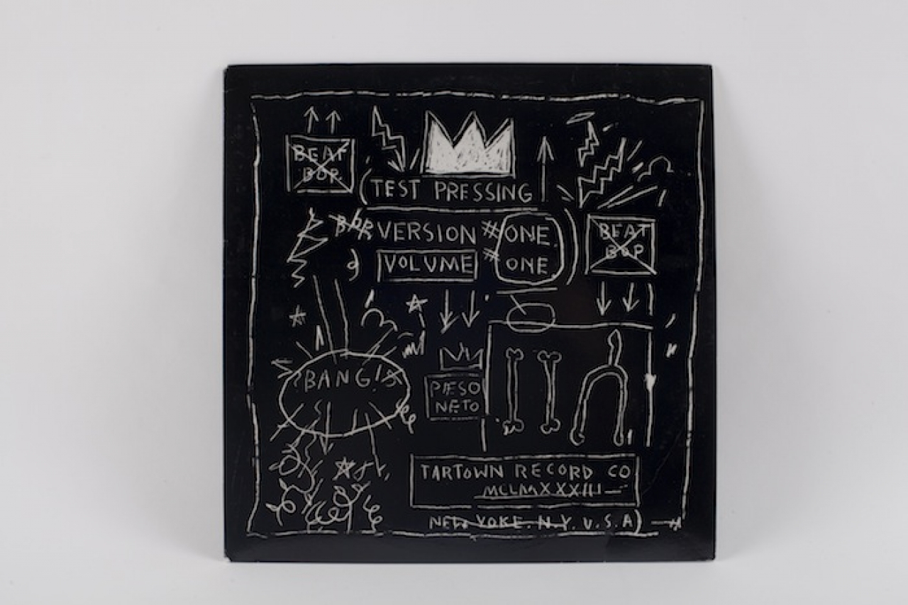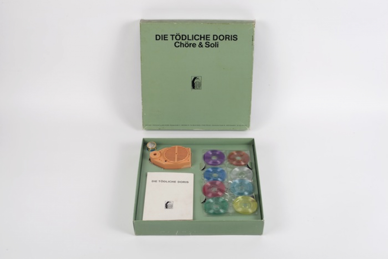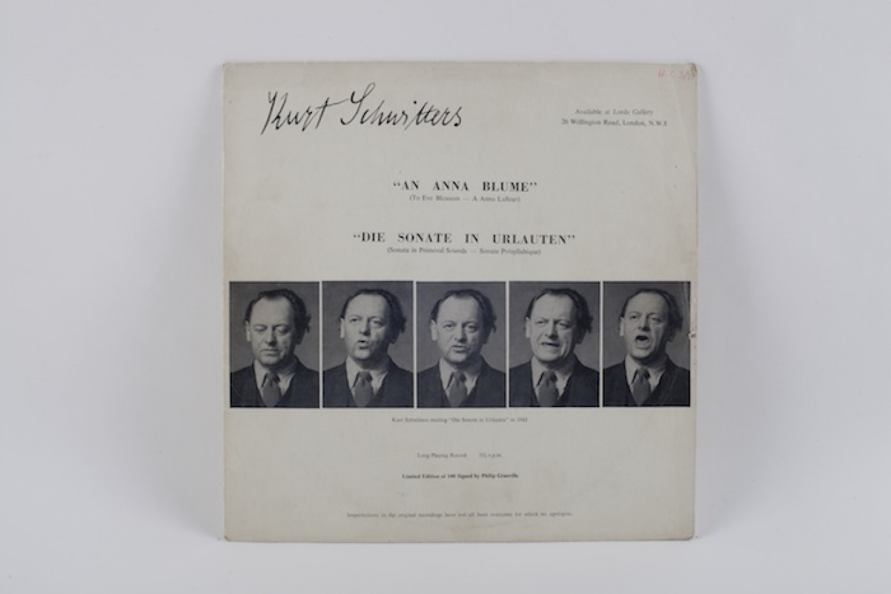 Onlangs werd er een videotape ontdekt uit 1989 waarin Pettibon samen met Mike Kelley figureert. Kelley, bij ons vooral bekend van zijn samengebonden kleurige knuffels, was ooit lid van die andere Californische punkband Destroy all Monsters. In het filmpje speelt hij een tienerjongen die wanhopig probeert een bandje op te richten. Pettibon schittert in een dreinerige rol als zijn goede kameraad ‘Vomit’. Dat de twee meer met elkaar gemeen hadden dan hun voorliefde voor West Coast Punk bewijst ook Kelley’s ontwerp voor een jongere platenhoes van Sonic Youth: het koddig gehaakte knuffeltje op Dirty uit 1992. Deze is ook te zien op ‘Visual Vinyl, maar Kelley is vooral vertegenwoordigd in de categorie kunstenaarsplaten. We zien hem bijvoorbeeld op een hoes verschijnen als de verlepte kruising tussen graaf Dracula en Conchita Wurst. De expositie is namelijk opgezet langs twee lijnen: Het gros toont hoezen die zijn ontworpen door gerenommerde kunstenaars zoals Jeff Koons, Damien Hirst en Julian Schnabel. De andere klasse bestaat uit obscure kunstenaarsplaten, meestal uitgebracht door galeriehouders, musea of de kunstenaar zelf. Vaak staat hier geen muziek op, maar voordrachten, hoorspelen of soundcapes. Zo is er een unieke opname van Kurt Schwitters uit de jaren veertig waarin hij met veel verve het fonetische klankgedicht ‘Anna Blume’ ten gehore brengt. De plaat werd in 1958 uitgebracht door zijn galeriehouder, slechts een luttele honderd stuks werden er geperst. Hier primeert niet de visuele kwaliteit van de hoes, maar de historische waarde van de opname. De echte vinyl fetisjist likt hier natuurlijk zijn vingers bij af, maar een gewone sterveling kan er niet zoveel mee want de opnames zijn helaas niet te beluisteren.