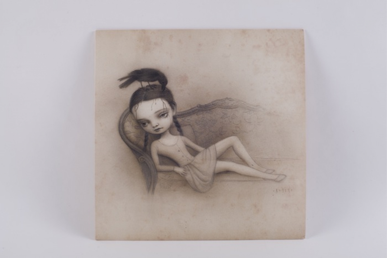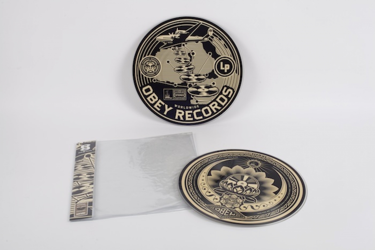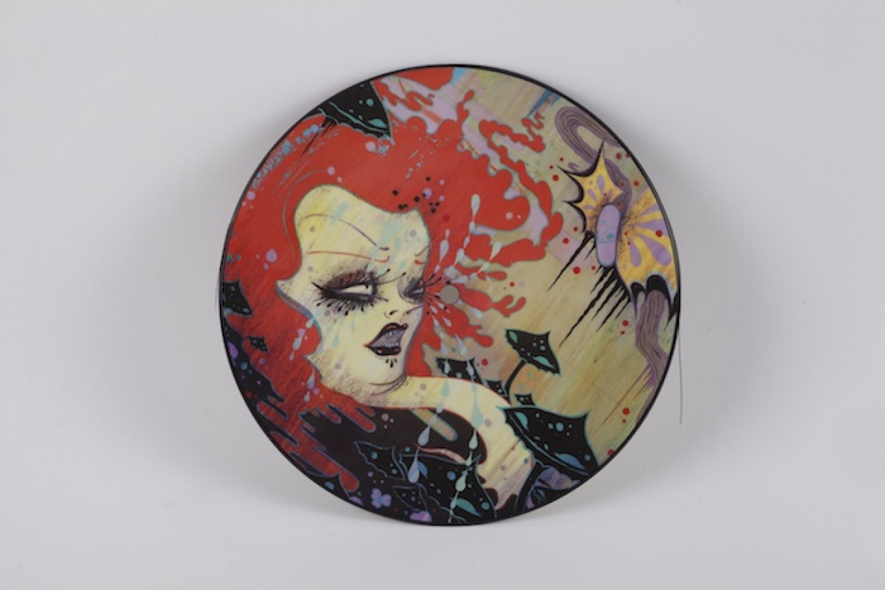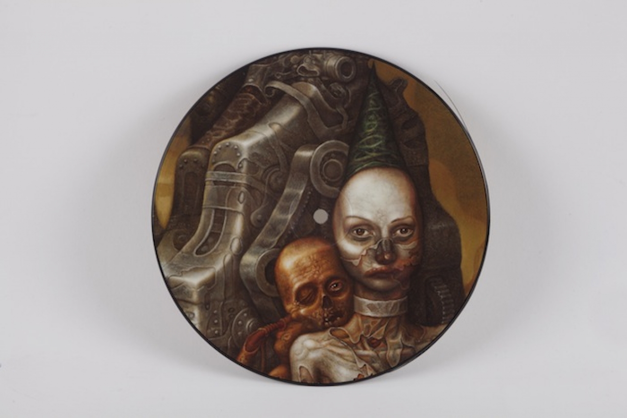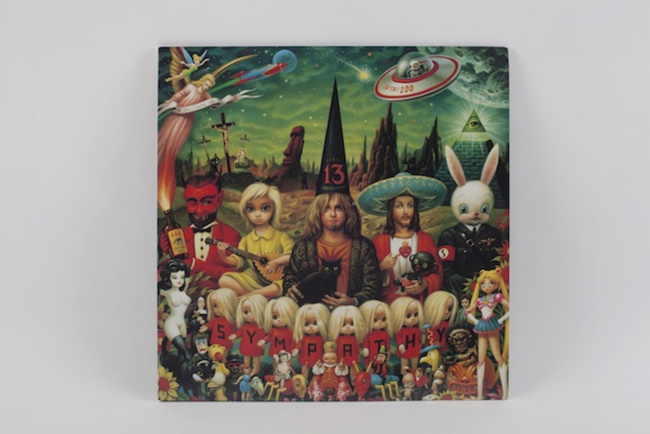 Vlak naast Pettibon hangt een andere oude bekende: Mark Ryden. Onze dochter had ooit een periode waarin haar hele meisjeskamer vol hing met kaartjes, knipsels en posters van deze artiest. Sinds ze op kamers woont zijn de zeemzoete plaatjes godzijdank opgeborgen in een schoenendoos. Maar ik zou zowel haar als de kunstenaar in kwestie tekort doen door zijn werk weg te zetten als puberale kitsch. In de museale setting van Visual Vinyl is de aantrekkingskracht van zijn gepenseelde sprookjes nog groter. Zonder enig spoor van ironie spint Mark Ryden Americana folk uit tot mythische ‘make believe’. Wat dat betreft pas hij naadloos in het rijtje van Norman Rockwell, de virtuoze mid-century illustrator die eigenhandig The American Dream in ieders verbeelding geprent heeft. We zien een allerliefst dametje in fifties jurkje op de hoes van ‘One Hot Minute’ van de Red Hot Chili Peppers. De kuisheid van het tuttige figuurtje botst met de stomende riffs die in de groeven van de plaat verstopt zitten. Daarnaast hangt de flamboyante hoes van de verzamelplaat ‘Their Sympathetic Majesties Request’. Christus, met Mexicaanse sombrero, staat broederlijk naast een paashaasje in Wehrmacht uniform. Rechts onderin zien we een sexy Barbie in Hentai stijl. Jezus geeft er geen mallemoer om, hij blijft stoïcijns vooruit kijken met zijn liefdevolle koeienogen. Het geheel doet denken aan onze omgang met de triptieken van Jeroen Bosch: We raken er niet op uitgekeken, ook al zijn we de spreekwoorden en gezegden waarnaar verwezen wordt al lang geleden kwijt geraakt.