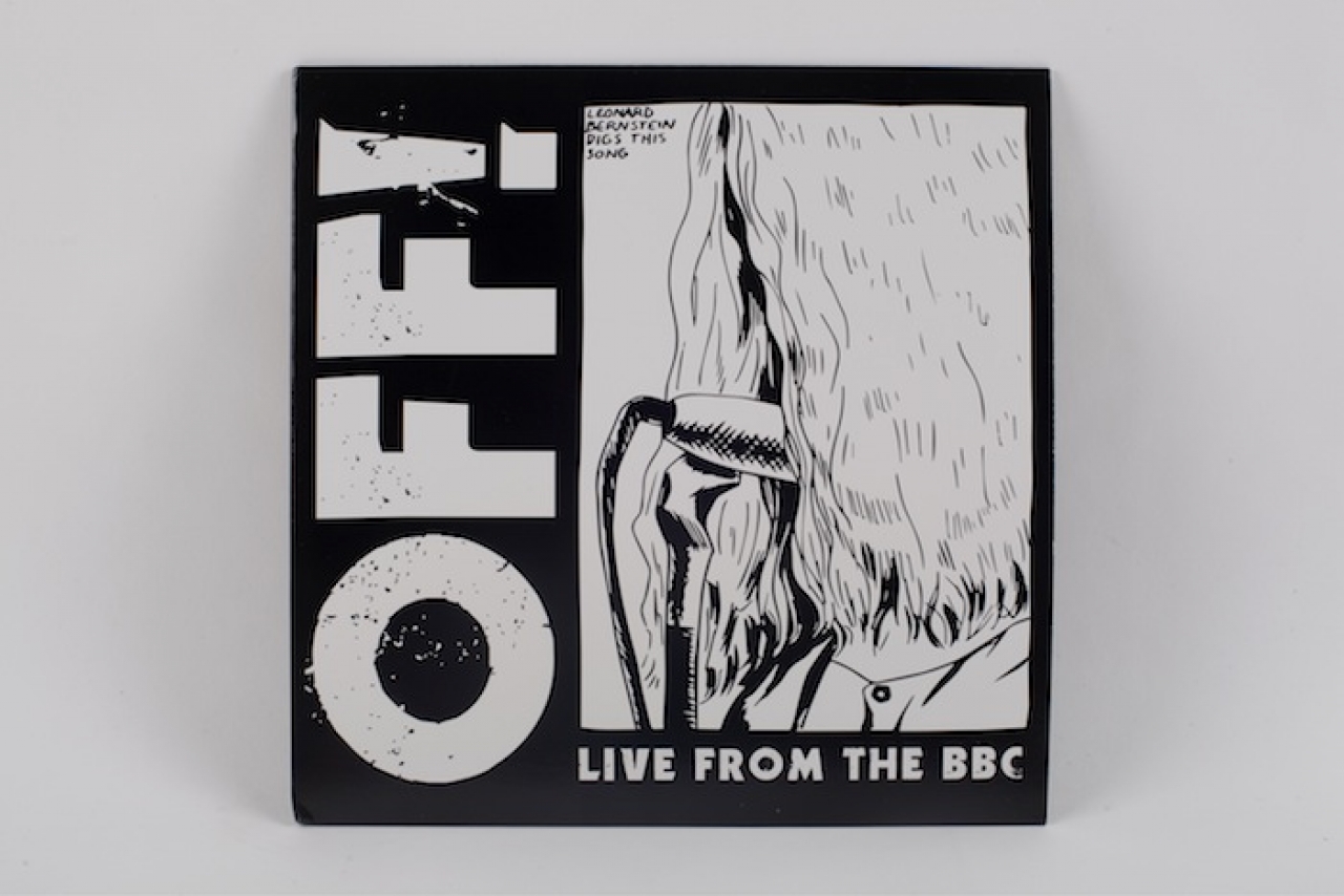 Pettibon werd in Europa vooral beroemd om zijn tekeningen voor Sonic Youth. Met name de zwart-wit hoes van het in 1990 uitgebrachte Goo is een mijlpaal in de popgeschiedenis. Deze prijkt dan ook centraal op een van de wanden. De bijtende lijnen en brute vlakverdeling zijn dermate iconisch dat er nog regelmatig parodieën en mash-ups verschijnen op Tumblr en Buzzfeed. De meest hilarische persiflage is wel die waarin Breaking Bad’s Walt en Jesse hun opwachting maken als bebrild Grunge koppel. Ondanks al deze online lol worden de hoezen van Pettibon nooit gemakkelijk, ze blijven happen en bijten naar de toeschouwer. Misschien zijn de kleine single hoesjes in de vitrines daar nog het beste voorbeeld van. Op het matte en sleetse papier springt de venijnigheid er eens zo hard vanaf. We zien een hoesje van de band Off! Een bonkige kerel met bivakmuts neemt de telefoon op: “Hi Laura, it’s Lee. I have a new number, do you want it?” De tekening is, net als de tekst, zowel dreigend als humoristisch. Tel daar de vuige lijnvoering bij op, en zelfs op klein formaat dwingt Pettibon de kijker op zijn knieën.
