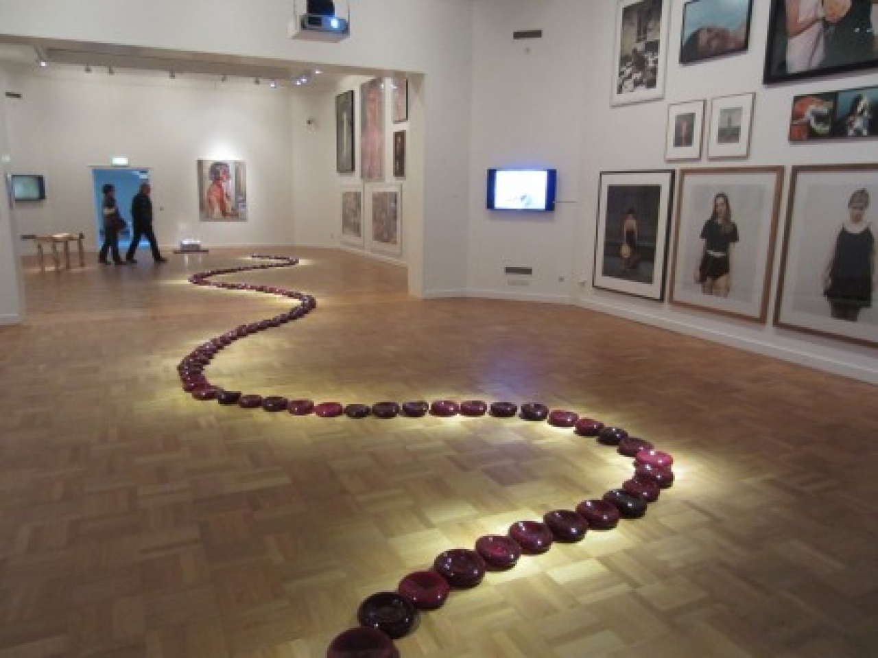 In het midden van de twee ruimtes liggen bloedrode glazen schalen in een lange, slingerende lijn over de vloer. De spots zijn direct op deze lijn gericht, waardoor de vloer eromheen net wat lichter gekleurd lijkt. Je kan niet om dit spoor heen, dat doet denken aan uitvergrootte bloedplaatjes, iedere schaal net anders van kleur, net anders gevormd. Als een spoor waar aan beide einden een abrupt einde komt. Het is een werk van Kiki Smith, genaamd ‘Bloedlijn”. Gemaakt in 1994, toen Aids won aan bekendheid binnen de Westerse wereld, en waaraan nog steeds een stigma kleeft. Door de situering van het werk, wordt daarnaast de link ook gelegd naar menstruatie, naar het bloed dat maandelijks vloeit en daarmee de mogelijkheid biedt voor het beginnen van nieuw leven.