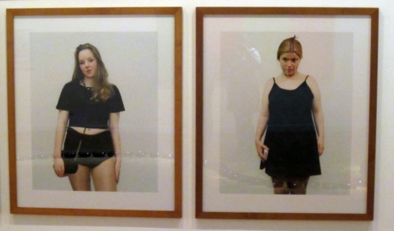 Aan de muur naast dit werk, hangen een aantal fotowerken. 2 daarvan, gemaakt door Rineke Dijkstra (the buzzclub), springen direct in het oog. Het zijn foto’s van jonge meisjes, in de transitiefase van kind naar jonge vrouw. Waar het baby-vet de wangen nog siert en de borsten langzaam vorm krijgen, staan ze midden in beeld en kijken uitdagend de camera in. Beiden zijn gekleed in zwarte uitgaans-outfits. De een draagt een klein heuptasje, de ander heeft een pakje sigaretten in haar handen. De heupen zijn licht gekanteld. Het is een vreemde gewaarwording; enerzijds lijken het kinderen gekleed in onthullende outfits die aandoenlijk volwassen vrouwen imiteren. Anderzijds zijn het jonge vrouwen, die nog het meest doen denken aan dames van lichte zede en zo van de straat geplukt zijn. Deze dichotomie maakt dat je blijft kijken; wil je het kind, of de opdoemende volwassenheid zien?