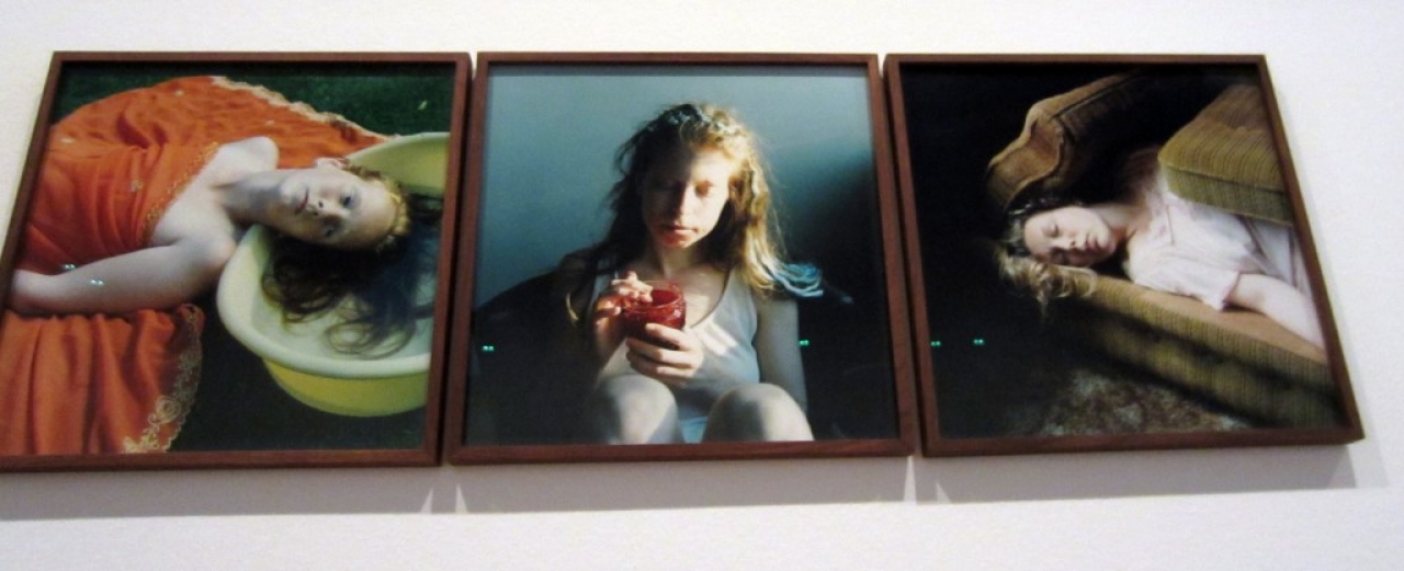 Schuin daarboven hangt een drieluik van Hellen van Meene, waarin opnieuw een jong meisje te zien is en waarbij vooral de foto links een soort onbedoelde seksualiteit verbeeld. Het is een jong meisje met koperblond haar, dat onder een dun oranje laken ligt. De deken onthuld een platte borstkas en het ontbreken van heupen. Ze ligt plat op haar rug, haar armen naast zich, met haar hoofd in een gele bak gevuld met water, waarin haar haren zich verspreiden. De ogen zijn half geloken en ze lijkt zachtjes te fronsen. Haar witte, bijna doorzichtige huid maakt het beeld breekbaar, bijna etherisch. Toch is het schokkend als je dit beeld vergelijkt met de huidige beeldcultuur, want is dit niet dezelfde houding die wordt gebruikt door modellen, die, als ik heel eerlijk ben, niet een product, maar seks verkopen. Het is een verontrustende gedachte dat kinderen dit genadeloos kopiëren, onder het toeziend oog van Van Meene.
