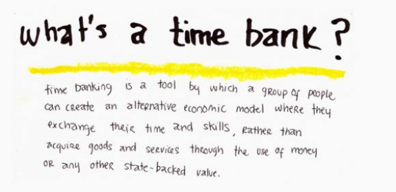 Time-banking is een antwoord op deze vraag. Het idee is niet nieuw, maar het is juist de reactie op ons huidige geldsysteem die het interessant maakt. Het concept is simpel: de valuta bestaat niet uit geld, maar uit tijd. Het hedendaagse time-banking ontstond rond de industriële revolutie en is inmiddels uitgegroeid tot een internationale beweging. De time-banks hebben als doel een autonome economie te vormen die losstaat van het staats-geregelde geldsysteem, om vervolgens een uitwisselingssysteem ontwikkelen waarin de waarde die toegekend wordt aan een dienst of object zo dicht mogelijk ligt bij de hoeveelheid menselijke arbeid die nodig is om het te maken / uit te voeren. Tijd wordt hierbij dus de valuta en er ontstaat dan vaak ook werkelijk een valuta-systeem van biljetten, in het algemeen vaak time-dollars genoemd, die gebruikt worden om mee te betalen. Vaak zijn het diensten die worden verhandeld, bijvoorbeeld: als jij iemand helpt met het doen van zijn belastingaangifte, verdien je het aantal uren die je hebt gespendeerd aan het helpen van diegene. Deze uren kun je vervolgens weer ergens anders aan uitgeven, om iemand jou te laten helpen met het schilderen van je huis bijvoorbeeld. Maar ook goederen kunnen worden gekocht met tijd. In zekere zin is time-banking dus een alternatieve economie, waarin vooral centraal staat dat het er een is die veel meer gebaseerd is op sociale banden, transparantie en solidariteit dan ons reguliere geldsysteem.