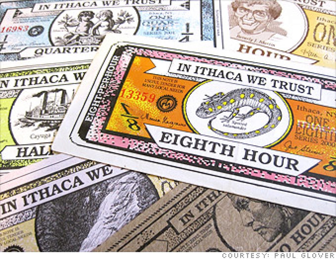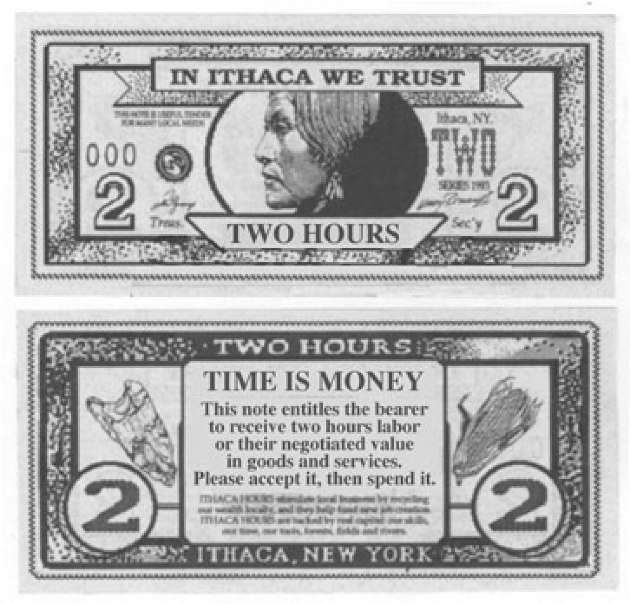 Ondertussen zijn er in zo’n 34 landen verschillende time-bank initiatieven actief, in Amerika en Engeland beide zelfs 300. Zo heeft de stad Ithaca in Amerika zijn eigen valuta die gebaseerd is op tijd: ‘Ithaca Hours’. Ithaca’s time-bank werd opgezet door kunstenaar Paul Glover in 1991 en wordt vaak gezien als een van de eerste succesvolle hedendaagse time-banks; op een gegeven draaide bijna de volledige stad op Ithaca Hours. ‘We all have time, and -without gold or silver, which the dollar does not have either – we created money backed by our time’ , aldus Glover. Ithaca Hours worden nog steeds gebruikt in Ithaca. Het brengt de gebruikers vooral vier voordelen: ze verdienen meer, omdat de valuta direct wordt geruild en binnen hun community blijft; ze zijn minder afhankelijk van de staat, de banken en het bestaande geldsysteem; ze leven minder belastend voor het milieu; en ze versterken en onderhouden hun community. Ze maken een bewuste keuze hoe hun tijd te gebruiken, en maken hiermee ook een politiek statement dat een voorbeeld vormt voor andere time-banks. Ze staan los van het systeem en creëren voor zichzelf een andere, meer vruchtbare, relatie tussen geld en tijd.