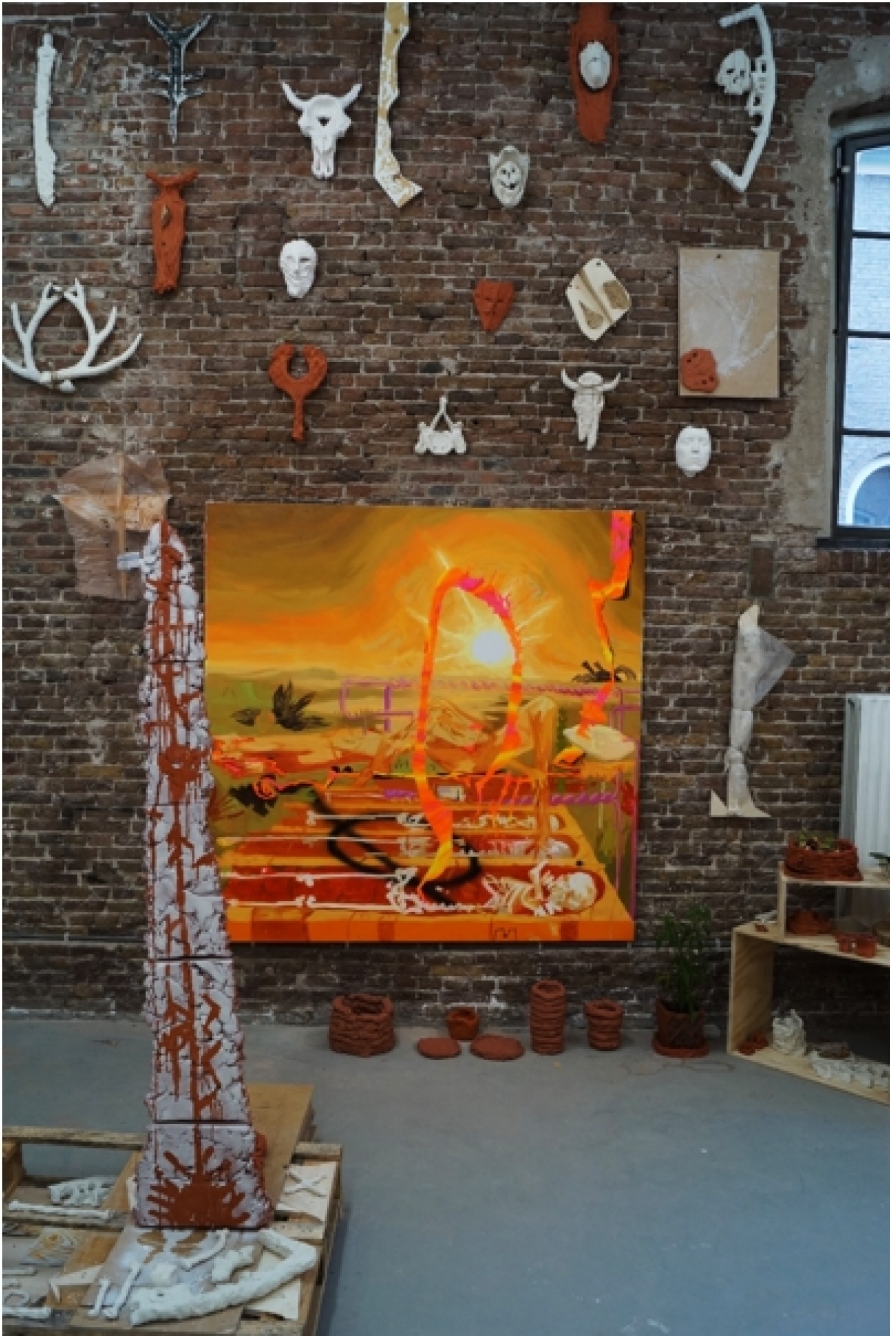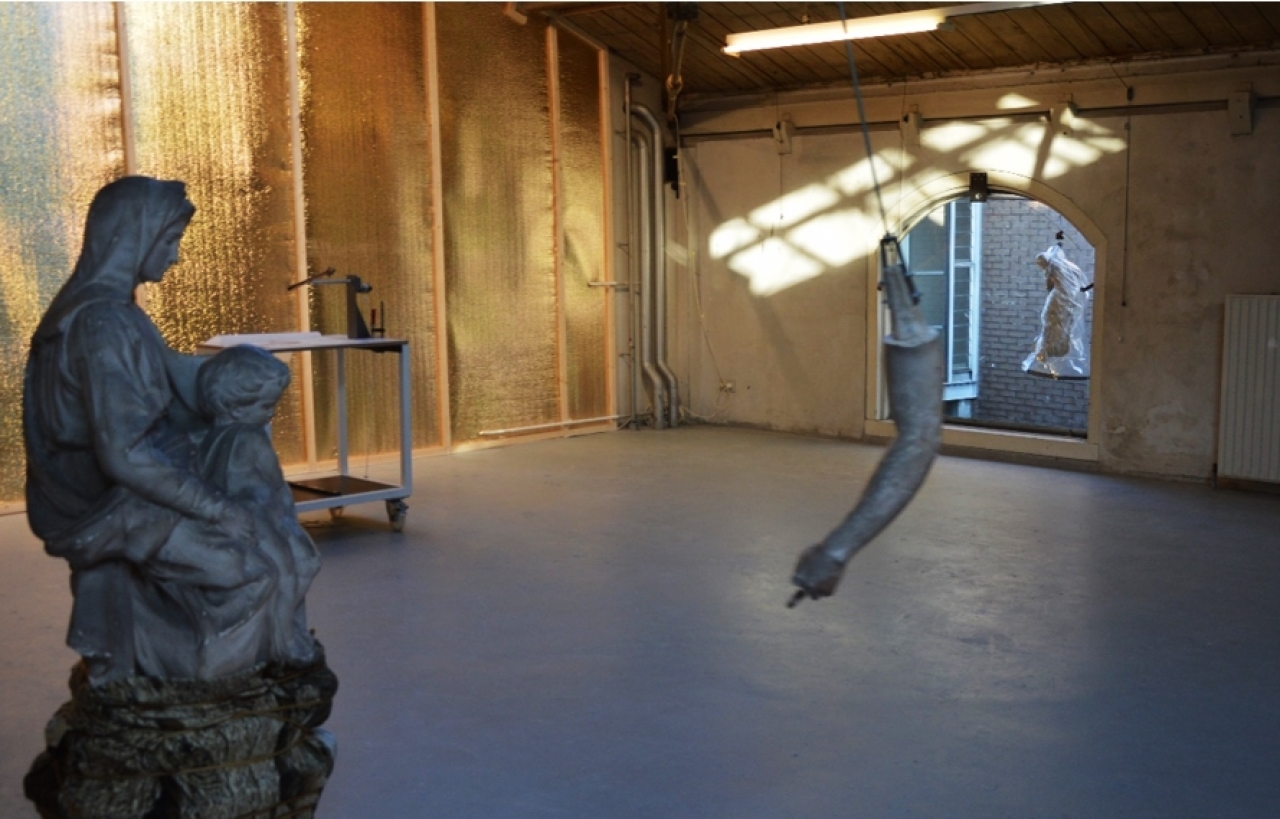 Midden in de ruimte staat een klassiek Mariabeeld, zij draagt Jezus in haar armen. Herhaaldelijk zweeft er een marmeren arm richting de piëta en tikt daarbij nèt niet de stenen huid van Maria aan. Een schouwspel dat lang je aandacht trekt, terwijl op de achtergrond galopperende hoeven zacht en gecontroleerd de grond raken. Enkel de stenen benen van het paard zijn aanwezig, maar doordat de bewegingen van de hoeven – die worden geproduceerd door een scala aan tandwielen en bedrading – ontzettend accuraat zijn, vormt het paard zich in je verbeelding. Aan iedere zijde van de deur hangt een beeldscherm. Op de schermen zijn twee onherkenbare mannen in beeld en gooien herhaaldelijk een zware, witte steen in elkaars armen, ze ogen vermoeid. Weisstub haalt inspiratie uit de geschiedenis van haar studio. Zij voelt de aanwezigheid van tientallen makers en vraagt zich sterk af of het nodig is nieuwe objecten te maken. De sculpturen in haar installatie zijn afkomstig uit de collectie van de Rijksakademie en vormen de performers in de ruimte. Het oog valt op het linkerraam. Aan weerszijden van het glas hangt een sculptuur hoog boven de grond, waardoor het beeld geen zwaartekracht lijkt te kennen.