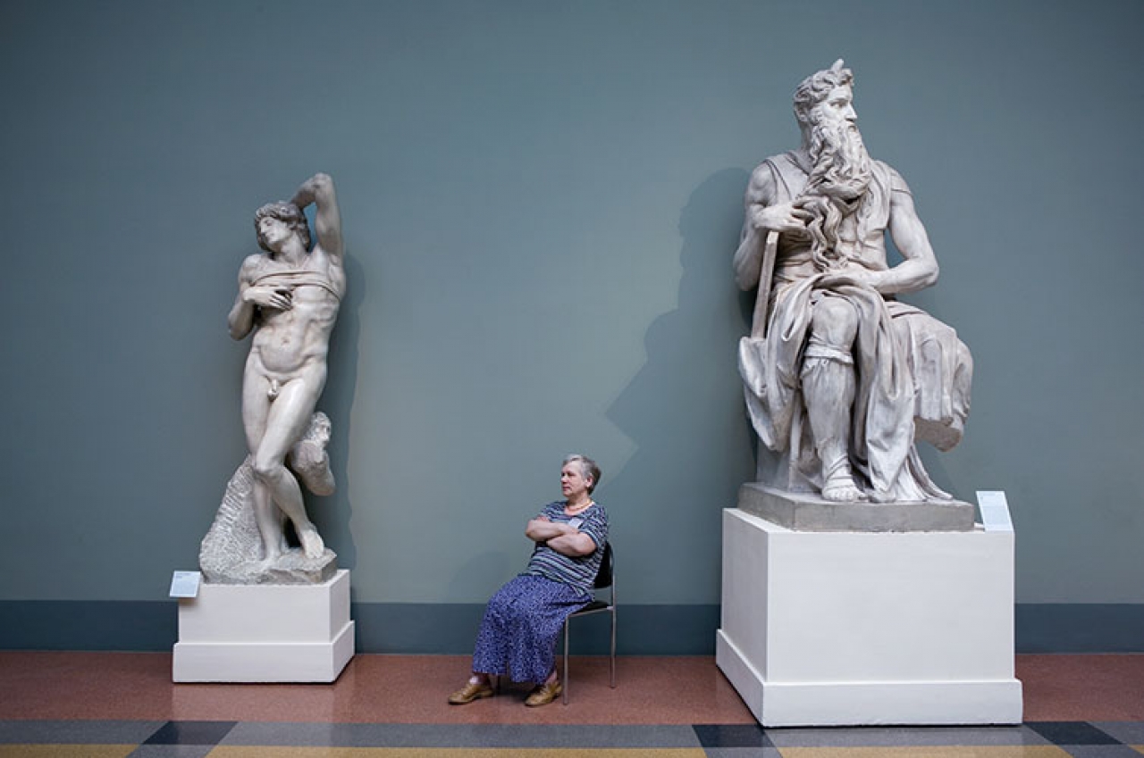 Fotograaf Andy Freeberg bezoekt dagelijks galeries en musea; niet vanwege hun beeldende kunst, maar vanwege the Gardians die over de kunst hoeden. De serie begon op vakantie. Net als iedere andere toerist begaf kunstenaar Andy Freeberg zich door parken, cafe’s en musea met zijn camera om zijn nek. Uit een lichte baldadigheid maakte hij stiekem foto’s van werknemers van galeries, zonder dat deze het in de gaten hadden. De foto’s straalden een hoog ‘candid camera’ gehalte uit. Toch printte hij de foto’s en nam ze mee naar Housten, waar jaarlijks het Photofest georganiseerd wordt. Of het het lot was, of puur het gelukkige toeval valt te betwisten, maar een van de hogere ministers van Rusland belandde in Housten op dit festival. De man was zo enthousiast dat hij Andy Freeberg uitnodigde in Moskou om daar gelegaliseerd de Sovjet bewaaksters te fotograferen. Freeberg bezocht de dames van de Russische Hermitage ’s winters en ’s zomers. “Summer has better light, winter has better outfits.” Aldus de kunstenaar. Nu de serie voldaan is hoopt Andy Freeberg te exposeren in Moskou en St. Peterburg, zodat de Guardians kunnen waken over hun eigen portretten.