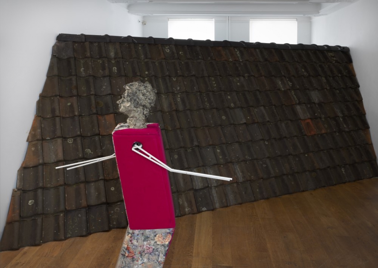 Sander en Witte hebben voor hun eerste museale solotentoonstelling de begane grond van Marres tot een typisch Nederlands daklandschap getransformeerd, inclusief zwarte bitumineuze dakbedekking. De nepschoorstenen voegen een extra laag toe en verlevendigen het geheel. Lopend over het teer en gravel—wat een eigen geluid en geur met zich mee brengt—begeef ik mij in verschillende scènes waarvan het exacte verhaal onduidelijk blijft. De eerste mensgrote sculptuur die ik tegen het lijf loop is in mijn ogen een beetje een louche figuur, hij draagt een blauwe vuilniszak. Wat deze man op het dak doet is een raadsel en wat er in die vuilniszak zit blijft onduidelijk. Is hij op de vlucht? Door een half geopend dakraam kijk ik stiekem even naar binnen en zie een televisiescherm waarop een figuur gekke bekken trekt.