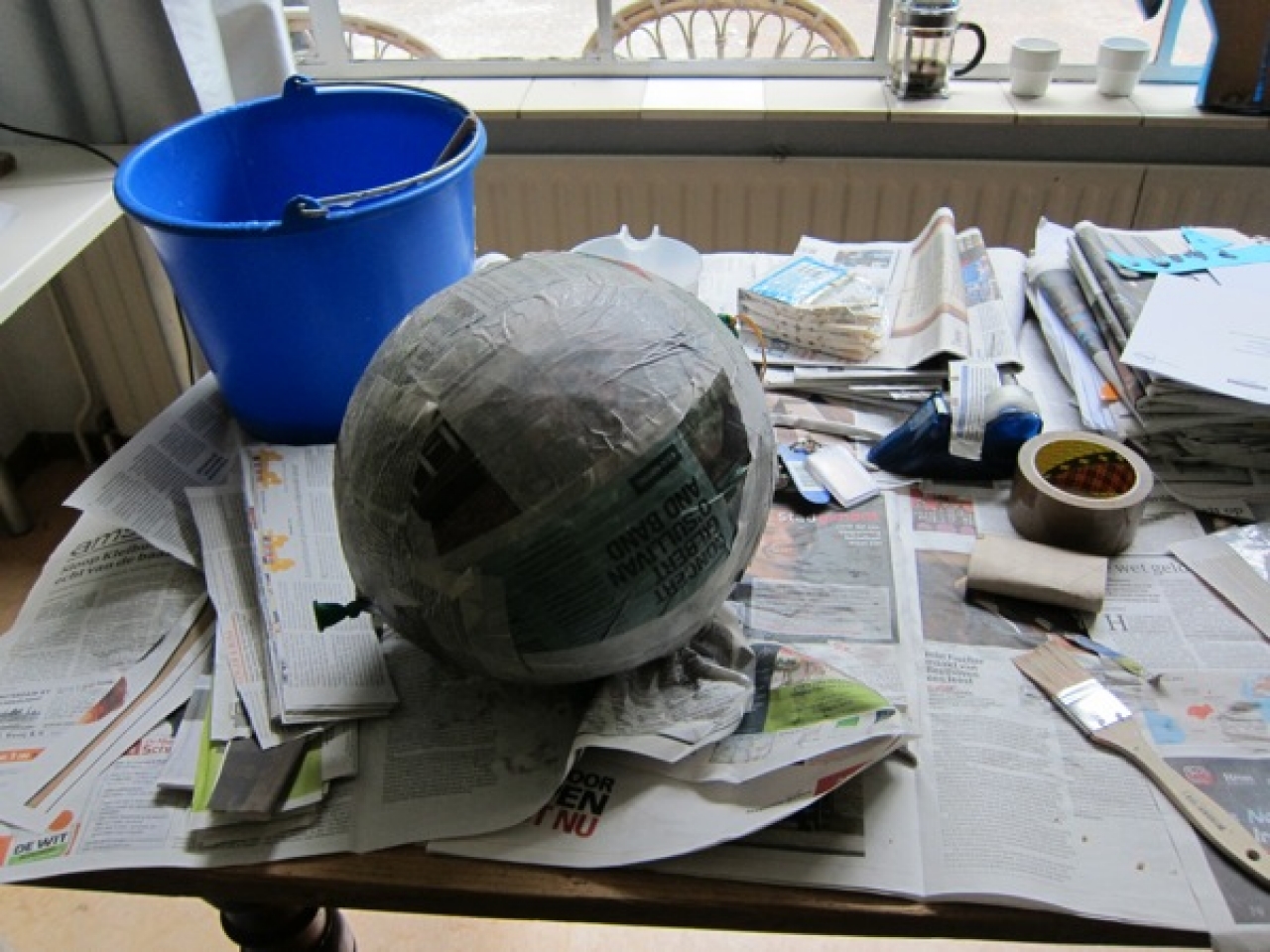 Mariska komt vragen of ze bij mij piñata’s mag komen maken. Bij haar op de afdeling is er geen plek voor en haar mede patiënten hebben er niet veel belangstelling voor. Omdat ik nog nooit piñata’s heb gemaakt wil Mariska me ook graag leren hoe het moet. Ze haalt een doos met allerlei materialen en richt een hoek van de woonkamer in als Piñata Atelier. Ze laat me zien hoe ik ballonnen moet beplakken met repen oude kranten en dat is wat ik deze middag doe. Als ik de ballonnen af heb, zie ik dat ik ze beplakt heb met de speciale bijlage van de krant over de Biënnale van Venetië. Op de ballonnen probeer ik nog wat te lezen en zie ik foto’s van een prachtig werk van Mark Manders. De kunst is hier ver weg en dichtbij tegelijk.