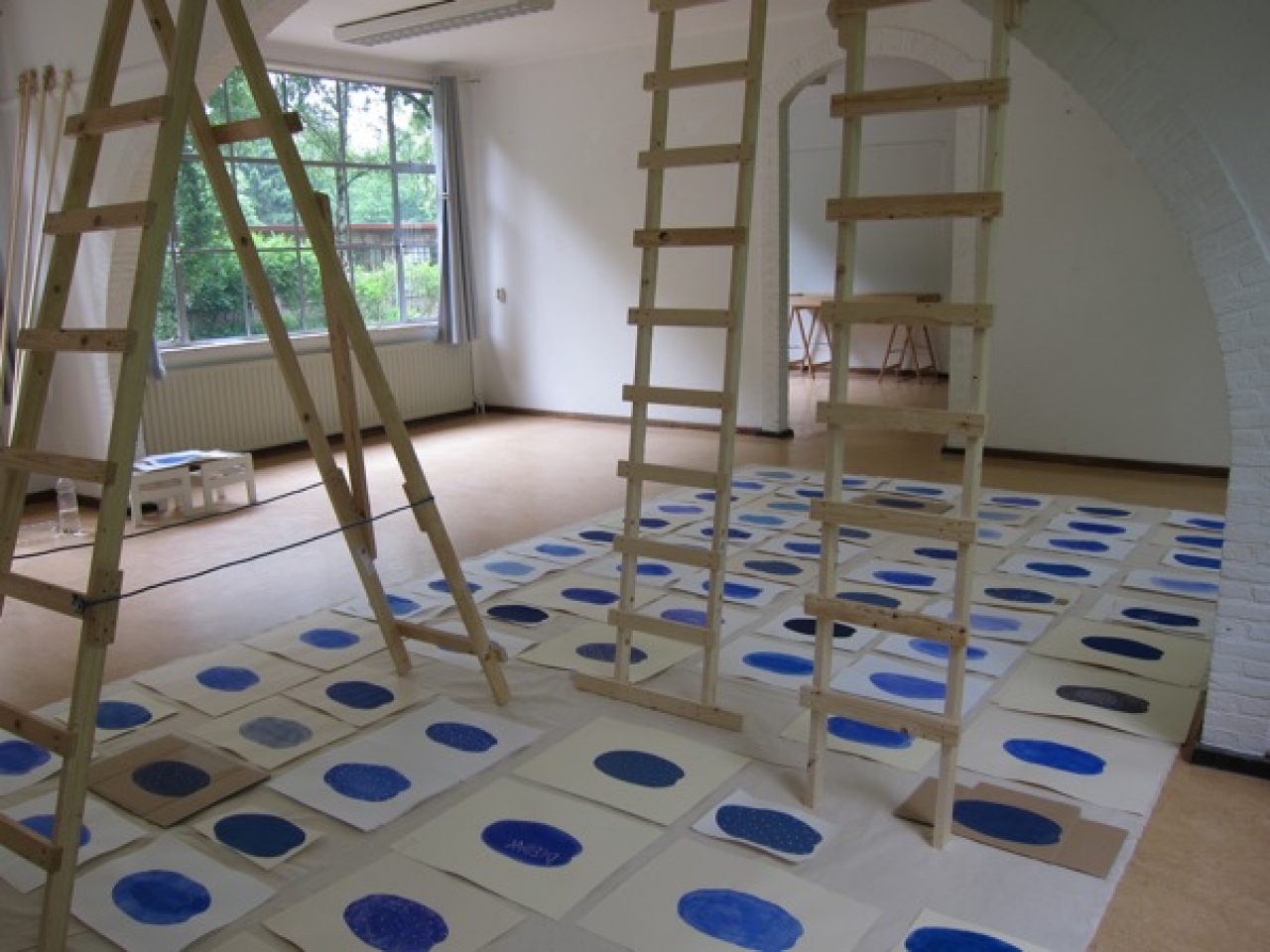 Ik tel 52 meditatie tekeningen die af zijn en nog een hoop halve. Ze liggen op een kleed op de grond en Anthony’s ladders staan er tussen. Ze vormen samen weer een eigen exotische kosmos, met ladders, om zelfs deze kosmos nog te ontstijgen.