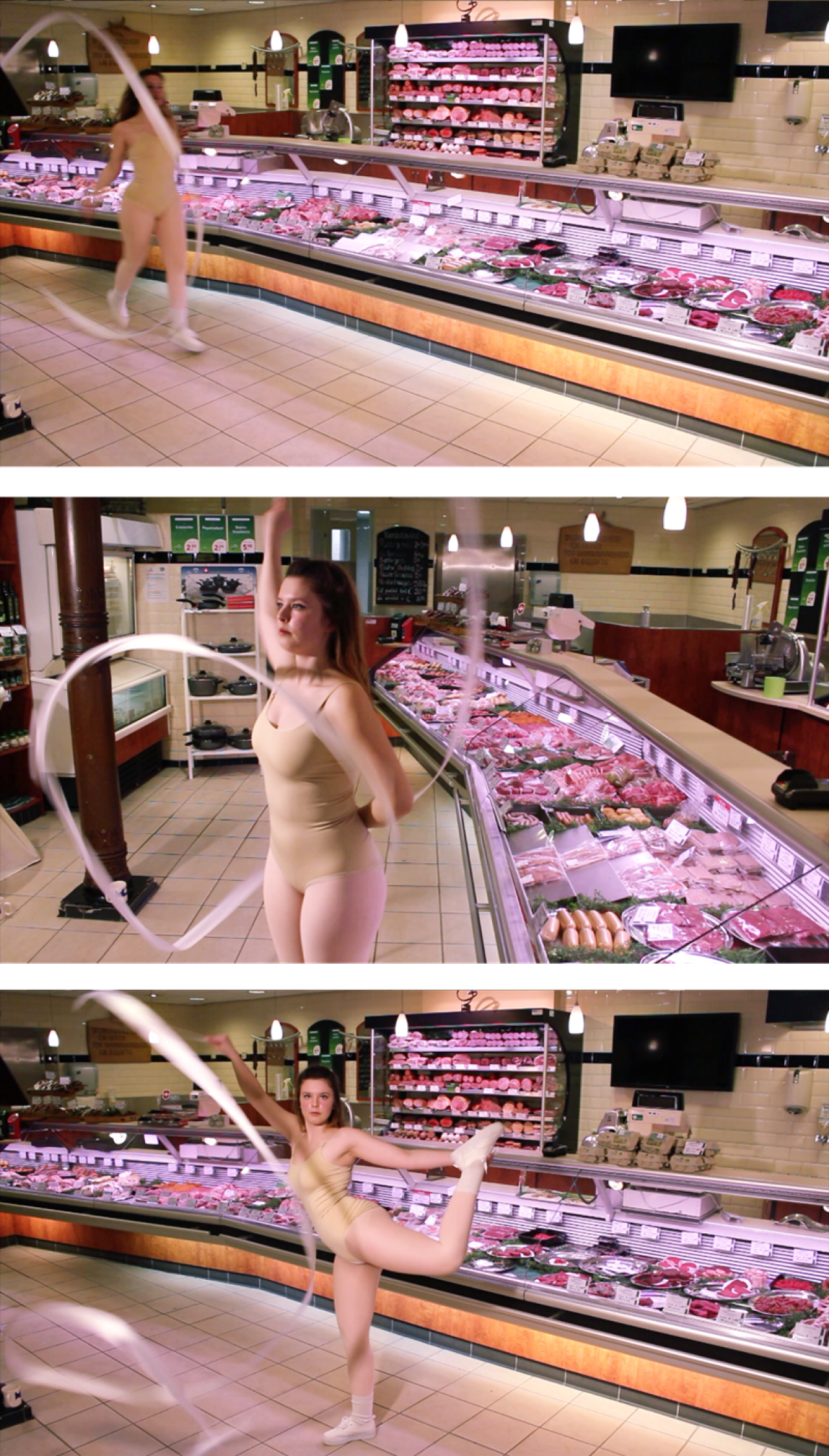 Deze existentiële crisis en tegenstrijdige gedachtegangen geven Kitty een speelveld waaruit ze inspiratie put. In het derde jaar van haar studie besluit ze verder te kijken dan de ‘white cube’ van de kunstwereld en naar buiten te treden met haar werk, waarbij ze de dagelijkse realiteit inzet als omgeving voor interventies. Haar eerste videoperformance speelt zich af in een supermarkt, waar ze het klassieke muziekstuk Irrlicht van Schubert zingt voor een perfect gespiegeld schap met chips. Er is een zekere spanning merkbaar, er zijn verschillende dingen gaande wanneer ze de Duitse tekst over een dwaallicht in een landschap zingt. Haar handeling heeft een vervreemdend effect en roept veel vragen op. Wat doet dat zingende meisje daar in die supermarkt? Waar zijn de winkelende mensen gebleven? Waarom kiest ze dit nummer uit en wat betekent het? “Ik vind de tekst van het muziekstuk heel interessant. Het gaat over het leven en dood en geeft kritiek op de rationaliteit van de verlichting. Door het muziekstuk daar te zingen, romantiseer ik als het ware de supermarkt, maar tegelijkertijd ontkracht ik de tekst doordat ik totaal niet kan zingen.” De plek en de handeling zijn erg contrasterend. Ze ontwricht als het ware de betekenis van de plek door Schubert voor te dragen. Dit is op een vergelijkbare manier ook het geval bij twee andere videoperformances; een waarin ze in een slagerij danst en figuren maakt in de lucht met een lint, terwijl ze tussen het uitgestalde vlees voor de vitrine staat. Tussendoor zijn enkele close-ups van het vlees te zien en de bereiding ervan, maar tijdens de performance zelf is wederom geen enkel ander persoon zichtbaar. In de derde video is Kitty te zien terwijl ze in de etalage van een Chinese Toko poseert en haar arm op en neer beweegt als een gelukskat. Dit keer is er wel publiek, er lopen winkelende mensen langs het raam die zich afvragen wat er gaande is. Met haar performances wil ze extreem georganiseerde plekken desorganiseren. Door chaos te creëren, kan de hele situatie heroverwogen worden of de vreemde essentie van de dingen benadrukt worden. Echter zonder waardeoordeel of wijzende vinger. “Ik probeer interventies te plegen zonder moraal, omdat ik al heel snel het idee heb dat mijn werk activistisch zou kunnen zijn en dat probeer ik juist tegen te houden. Daarom verricht ik handelingen die heel veel dingen in het midden laten en geen vragen beantwoorden, maar wel een interessant contrast op kunnen brengen met de omgeving.”
