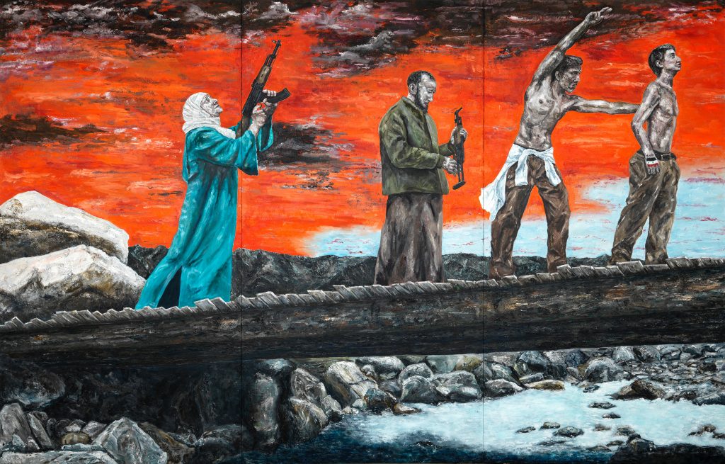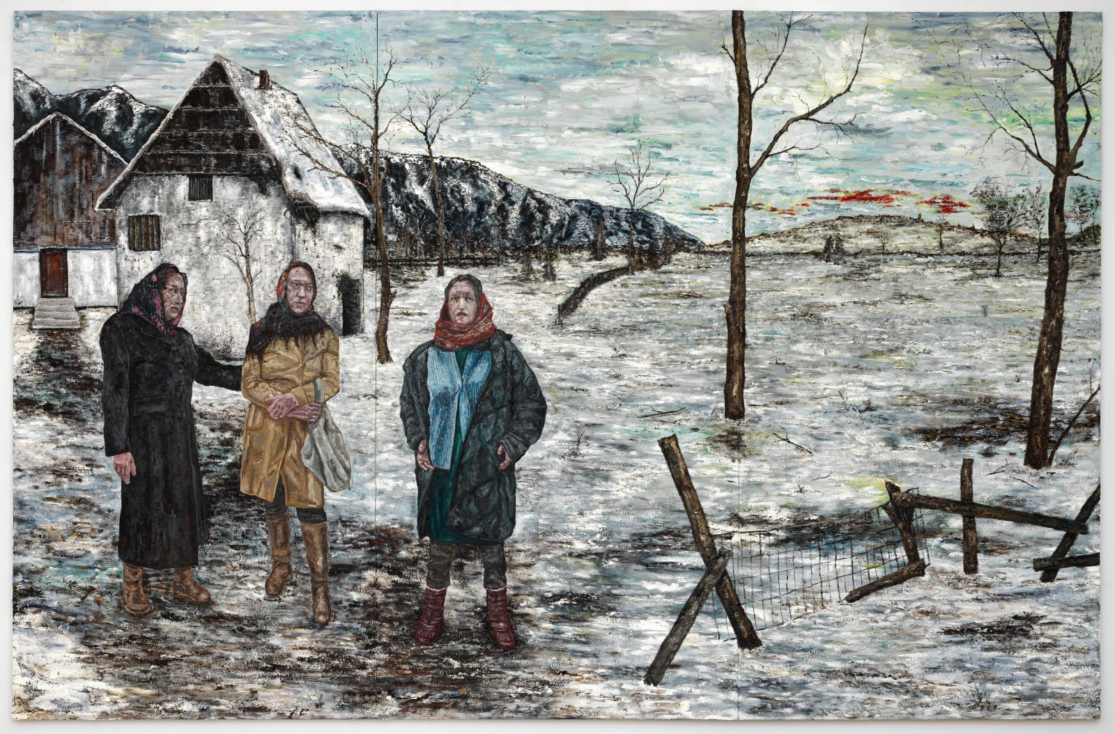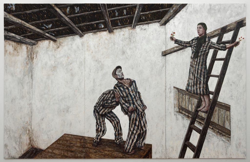“Aan de rand van de stad waar ik nu woon, zie ik taferelen van mensen en dieren die weinig te maken hebben met de conflictsituaties waar ik me in mijn werk altijd mee heb beziggehouden. Daar waar het platteland begint en schapen, geiten en koeien rondlopen in rafelige landschapjes zie ik voor mijn ogen iets voltrekken waar ik nu door word getroffen. Ik werk nog wel aan het upgraden van oudere schilderijen en het maken van portretten van mensen die voor thema’s als menselijke geweld, oorlog en misdaden tegen de menselijkheid van betekenis zijn, zoals Primo Levi, Imre Kertész en Varlam Sjalamov, maar ik kijk nu vooral naar mijn directe omgeving.”