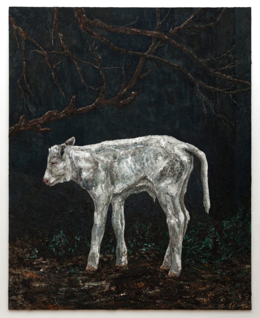 “Mijn recente schilderijen van een kalf of een schaap dat wordt geschoren zijn niet gemaakt als kritiek op de bio-industrie met zijn megastallen. Het zijn beesten in hun op zichzelf teruggeworpen gedaante. Ik kijk onder meer naar het werk van de Italiaanse impressionist Giovanni Segantini om mijn benadering van het onderwerp te bepalen. Met een koe in een stal wordt niet altijd even zachtzinnig omgegaan, en een schaap dat je met zo’n grote tondeuse te lijf gaat, wordt ook niet voorzichtig geschoren; dat kan met bloedende wonden gepaard gaan. De gekoesterde idylle van de kleine boer is ook een dubieus ideaalbeeld.”