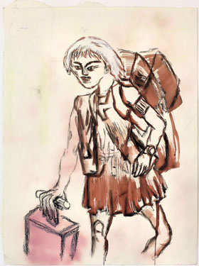 Je tekeningen zijn nu vaak een neerslag van wat er in de wereld gaande is. Toch hebben ze iets tijdloos. Alles wat je de laatste twintig jaar hebt gemaakt, zou je gisteren getekend kunnen hebben. Zo is er een klein werk dat me bijzonder aangrijpt, van een meisje met een schooltas op haar rug die elk moment als een bom kan ontploffen. Welke intentie heb je met dat werk?