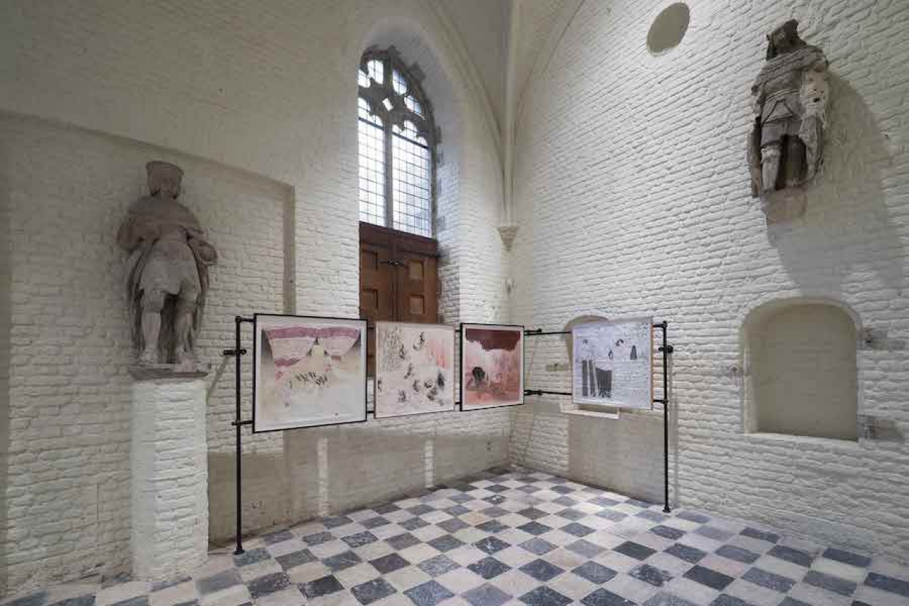 In de Vleeshal in hartje Middelburg brengen de drie jonge kunstenaars Evelyn Taocheng Wang, Leda Bourgogne en Nora Turato hun uiteenlopende kunstpraktijk samen in de tentoonstelling Show Personality, Not Personal Items. Volgens de tentoonstellingstekst die de expositie aankondigt hebben de kunstenaars weliswaar een verschillende werkwijze en stem, maar worden er in hun werk overkoepelende thema’s behandeld, zoals machtsverhoudingen, luststructuren en maatschappelijke normen. Wat opvalt als je door de imposante Vleeshal loopt, is dat de werken eerder een bepaalde intimiteit als gemene deler lijken te hebben, en dan met name de expliciet autobiografische aard van de tekeningen van Evelyn Tsaocheng Wang (1981), en de werken van Leda Bourgogne (1988), waar een verlangen naar bovenzintuiglijkheid uit lijkt te spreken.