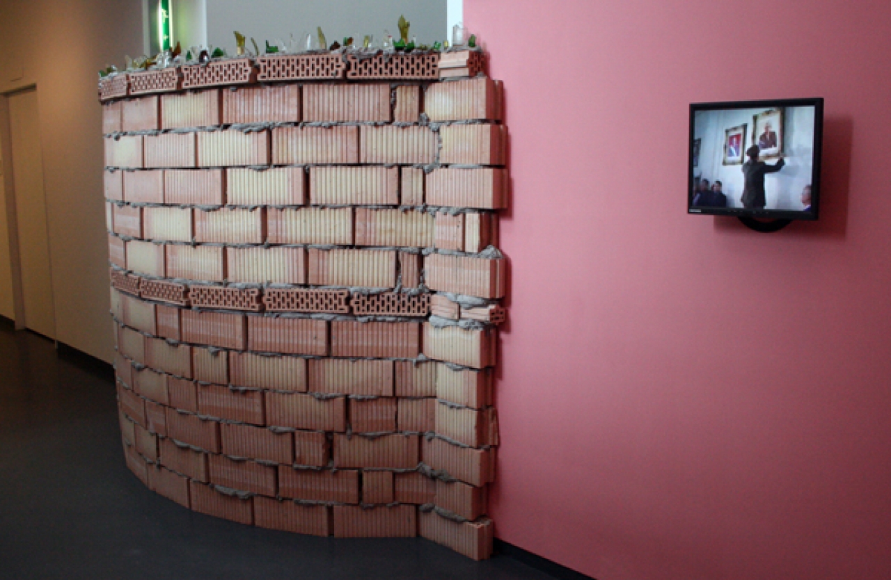 Dick wijst me op een toetsenbord en een apenmasker die op een tafel zijn vastgeplakt. ‘Dit gaat ook in de trofeekamer. Zie je dit kleine apparaatje? Dat kan ik gewoon niet weggooien. Dus maak ik er wat van. Vroeger was het een geheim mechaniek dat ik in een wasmachine had verstopt. Als je aan de knop draaide speelde het venster een soap af.’