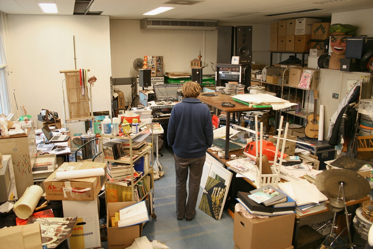 ‘Toeval. Ik heb kasten vol met inhoud. Ik hoef maar ergens een trap tegenaan te geven of er rolt iets van belang naar buiten. Bovendien zit ik vol verhalen die ik wil vertellen. Daar werk ik mee. Drie weken geleden zat ik nog in een bomvolle ruimte. Dat reflecteerde de inhoud van mijn kop. Daar heb ik het verticale atelier bedacht.’ Dick loopt op een stellage af waar schilderijen plat zijn opgeborgen. ‘Zo hoef ik ze ook nooit te zien. En het is ook nog praktisch. Ik hoef nooit kwastjes af te wassen; als ik oranje gebruik, zet ik gelijk op elk schilderij een streep. De volgende dag is blauw aan de beurt.’