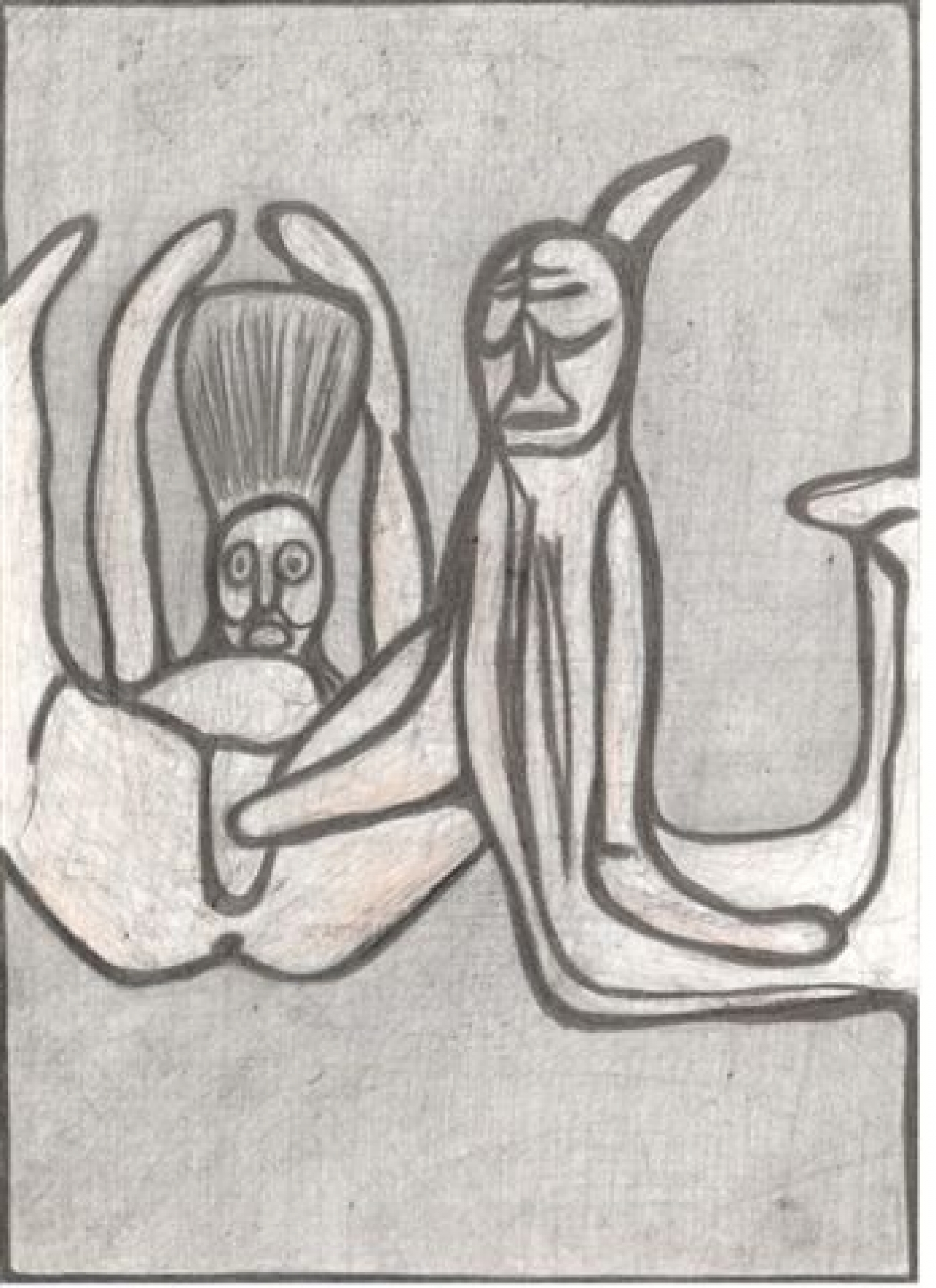 ‘Ik moet mijn hand heel slap houden. Dan voel ik vanzelf of het interessant wordt. Steeds neem ik een beslissing of niet. Waarom zou ik deze ruimte wel of niet invullen? Bij deze tekening word je er direct ingetrokken door de ruimte die ik onderin heb vrijgelaten. Ik analyseer al mijn werk. Dat is wat jongeren moeten doen: leren kritisch naar zichzelf te kijken. Leraren hebben het alleen maar over zichzelf. Als je vijf jaar lang met een leerling moet werken, worden leraren soft. Ik ben knetterhard, ze huilen wel eens. Al die jongeren hebben te veel hormonen, ik ruik het zelfs. Ze willen te graag kunst maken, dan sta je jezelf in de weg. Je moet het nooit voor iemand anders doen. Misschien had ik het makkelijk op de avondacademie.’