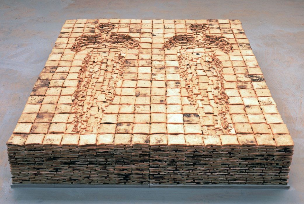 Net als een banaan vergaat brood vrij snel. Gormley voelde zich dan ook genoodzaakt om Bed uit elkaar te halen, alle sneetjes te laten drogen en vervolgens te dopen in paraffine, een was waar ook kaarsen en waskrijtjes van worden gemaakt. Dat maakt dat Bed bijna veertig jaar later nog steeds onderdeel is van de collectie van het Tate Museum. Best jammer eigenlijk, want het doet afbreuk aan een essentiële eigenschap van etenskunst: het is bederfelijk, en dus eindig. Eten als materiaal voor kunst is ideale manier om ons te confronteren met thema’s van verval en eindigheid. Felix Gonzalez-Torres’ Untitled (Portrait of Ross in L.A.) uit 1991 bijvoorbeeld. Een prachtig eenvoudig werk, bestaande uit een berg van gekleurde verpakte snoepjes – zulke merkloze zuurtjes die je doen denken aan de snoeptrommel van je oma, een prachtig onschuldige kindertijd. De berg weegt precies zoveel als Felix’ geliefde Ross Laycock, op het moment dat bij hem AIDS werd geconstateerd. Wanneer het publiek snoepjes van de stapel pakt en opeet wordt de stapel steeds kleiner en lichter: een parallel met het vreselijke aftakelingsproces van Ross, die vermagerde en uiteindelijk aan de gevolgen van HIV/ADIS overleed. Het publiek neemt deel aan de rituele vertering van een lichaam, zoals ook bij de heilige communie gebeurt (Gonzalez-Torres had een katholieke achtergrond). In zekere zin blijft het lichaam van Ross doorleven door onderdeel van andere lichamen te worden. En zelfs zonder het publiek is Untitled (Portrait of Ross in L.A.) in een voortdurende staat van vertering – ook harde snoepjes zullen onder invloed van warmte en luchtvochtigheid bederven.