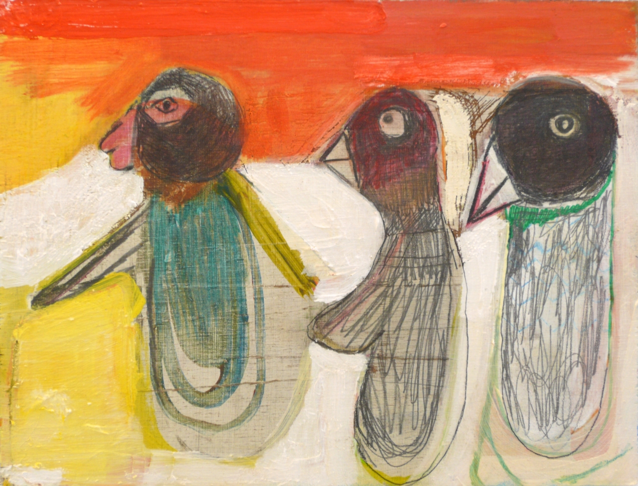 De schilderijen en tekeningen van Manu Baeyens lijken met veel gemak gemaakt. Ze stralen een kinderlijk plezier in het creëren uit, en dat gaat er ook aan gepaard. De kunstenaar denkt echter over elke actie in het maakproces zorgvuldig na. Zo kan het zijn dat aan een werk dat ogenschijnlijk in een snelle actie lijkt te zijn gemaakt in werkelijkheid wel een half jaar is gewerkt. Het zijn beeldassemblages waarin verschillende materialen elkaar vinden; papier, oude illustraties, stukken stof, plastic of hout. Dat is passen en meten en op het juiste moment beslissen wat waar komt. Baeyens’ onderwerpen zijn persoonlijk en poëtisch, vaak grappig, soms banaal. Mannetjes en dieren bevolken zijn wereld, waarin geen voorgeschreven regels zijn, een fantasierijke planeet vol kleuren en zonder grenzen. – Tsjalling Venema