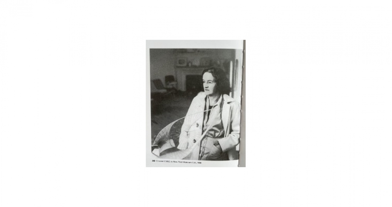 De andere foto is uit 1958. Er staat een vrouw op met een opvallend gezicht: voorhoofd als van een Grieks marmeren beeld, goeie kin, scherpe neus – en dat alles net zo wit als de krijtrotsen langs de Engelse kust. Ze draagt een lange jas en daaronder een overall met een rits. Op de voorgrond een sculptuur die lijkt op een ingewikkeld snaarinstrument: een gebogen vorm van messing, als de omhoog gevouwen vleugels van een zeemeeuw, bijeengehouden door talloze strakgespannen touwtjes. Het beeld oogt licht, klaar om op te stijgen. Wat ruim 25 jaar eerder begon als een stuk albast met een gat erin, groeide uit tot deze opengewerkte vorm die in dit geval bestaat uit geaccentueerde leegte met een laagje messing eromheen. Het is nu de binnenkant die bepaalt hoe de buitenkant eruitziet. De vrouw heeft haar linkerhand diep in de zak van haar overall gestoken.