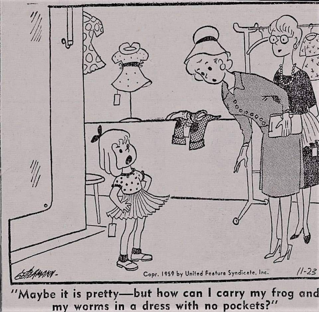 Het zijn vooral vrouwen die artikelen en zelfs boeken wijden aan dit onderwerp. Dat komt doordat vrouwen er wat zakken betreft al decennialang bekaaid vanaf komen. Er bestaat een Amerikaanse cartoon uit 1959, waarin een meisje door haar moeder in een nieuwe jurk is gehesen en verontwaardigd zegt: ‘Hij mag dan wel mooi zijn – maar hoe kan ik mijn kikker en mijn wormen meenemen in een jurk zonder zakken?’