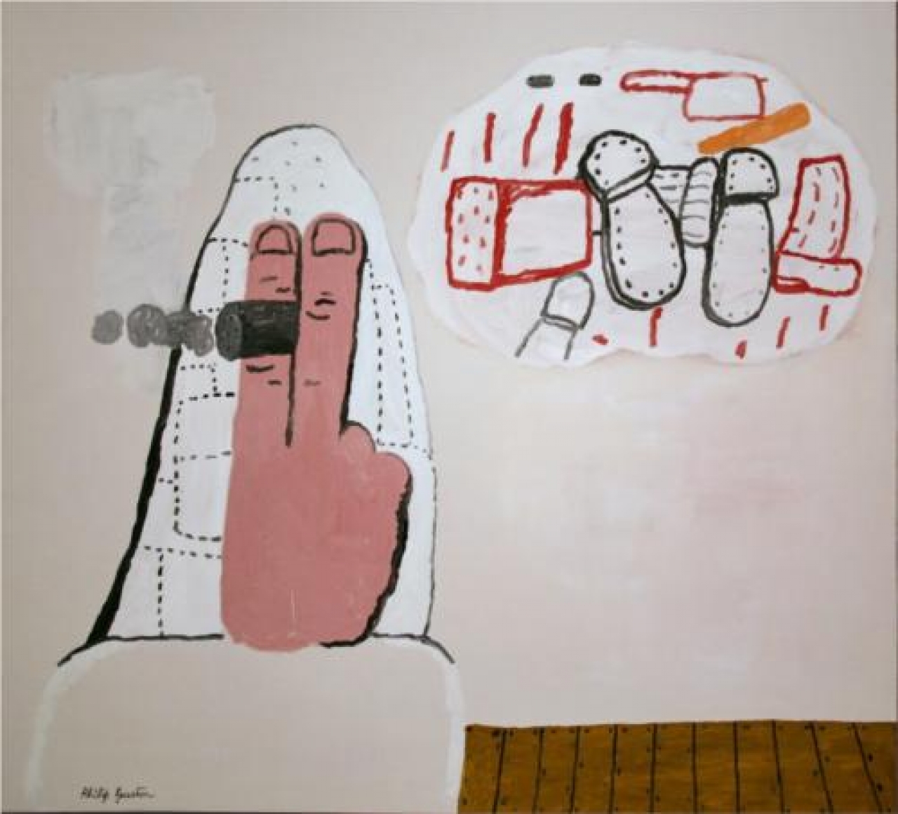Philip Guston is zo’n kunstenaar die op vrijwel iedere foto een peuk tussen de vingers heeft. Een vriendelijke man met een lang hoofd, open ogen en iets onmiskenbaar droevigs. Adrian Searle beschreef Guston als een man die werd achtervolgd door zichzelf. Hij was zijn eigen demon, gedreven door angst, zelfdestructie, geobsedeerd door werk, pillen slikkend en hij dronk te veel.